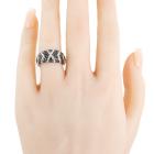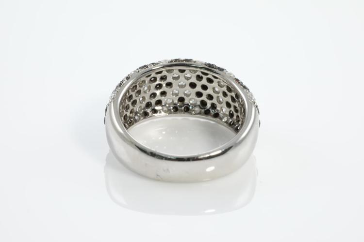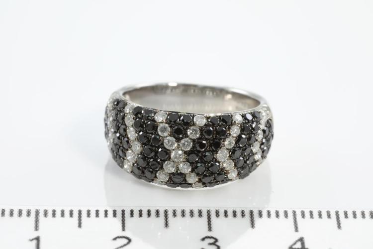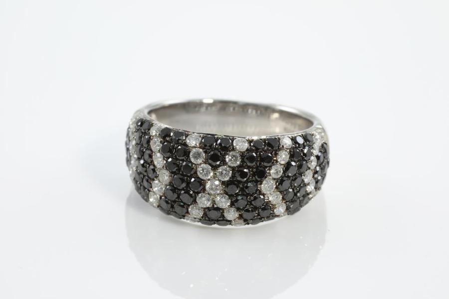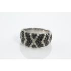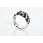 Diamond Ring with round black Natural Diamonds (colour may be treated) totalling 1.18cts and round white natural Diamonds totalling 0.54cts (Estimated grading: H P1). 14ct white gold. Ring size: K1/2. Weight: 5.1g (As New)^