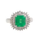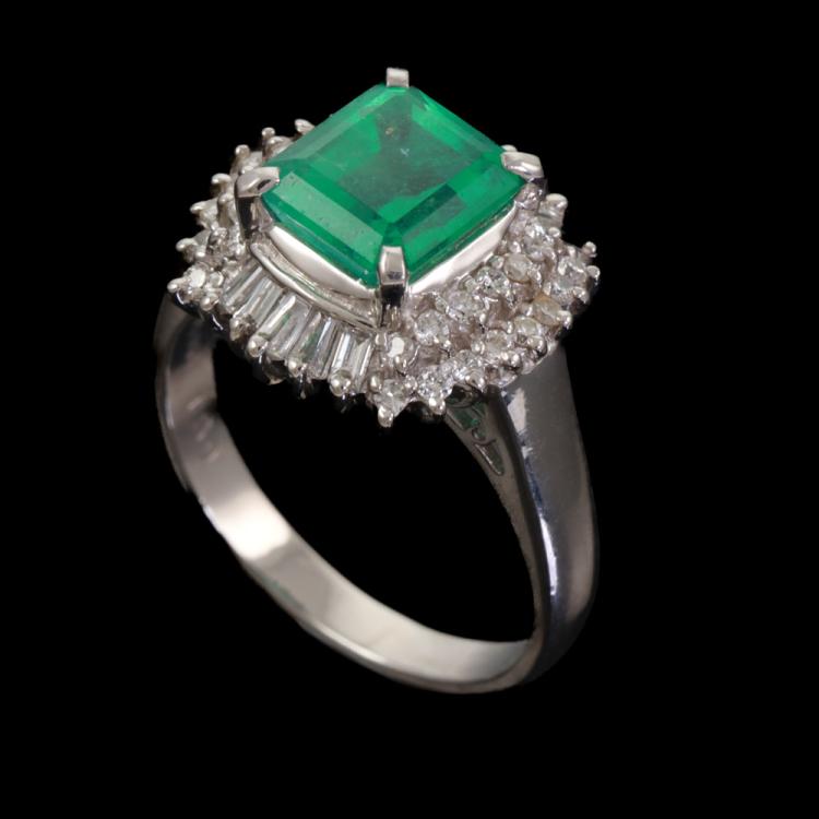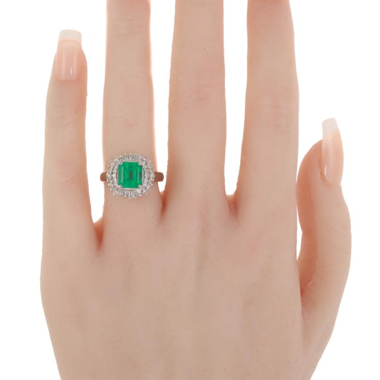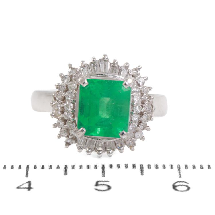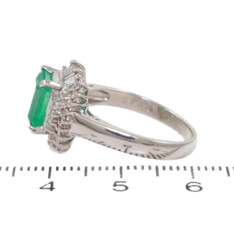 Emerald and Diamond ring with emerald cut Natural Emerald of 1.89ct with round & baguette cut Natural Diamonds totalling 0.50ct (Estimated grading: G-H SI-P1). Platinum - 900. Ring size: K. Band width: 2.4mm - 3.4mm. Weight: 7.0g. (Pre-owned)