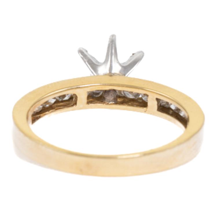 18ct gold 6 claw semi mount ring (note centre stone is not included) for 6.5mm centre round stone. Set with round natural Diamonds totalling 0.43ct (Estimated Grading: J P1). 18ct yellow and white gold. Ring size: M. Band width: 2.4mm - 3.0mm. Weight: 3.9g. (As new)