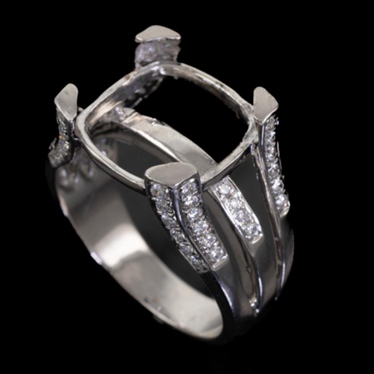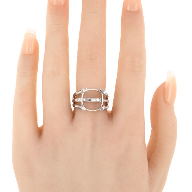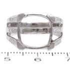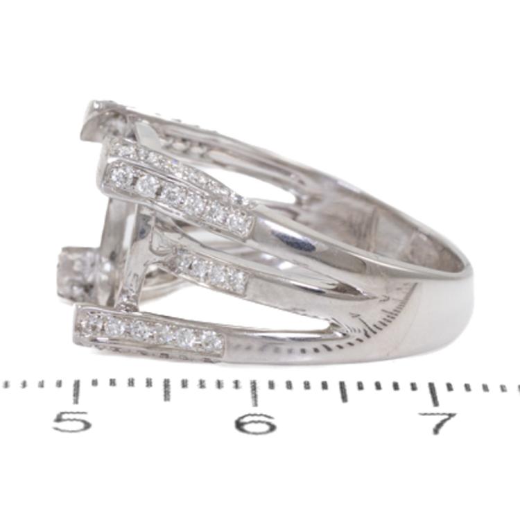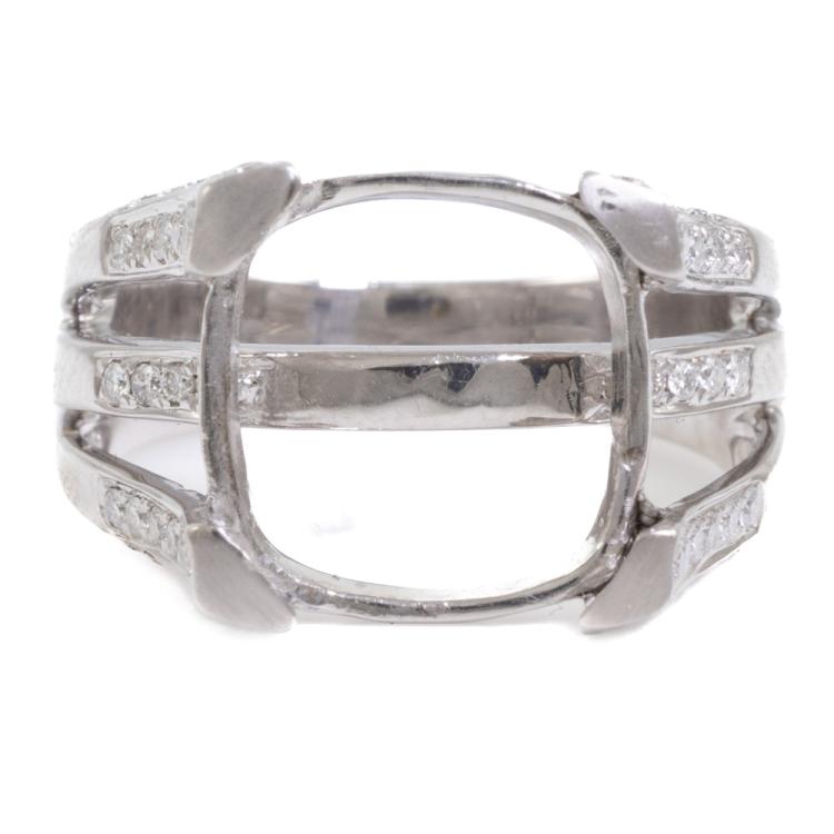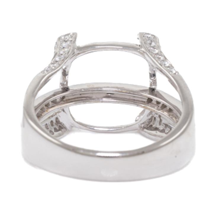 18ct white gold 4 claw semi mount ring (note centre stone is not included) for 10.0mm x 10.0mm centre cushion cut stone. Set with round natural Diamonds totalling 0.41ct (Estimated Grading: G-H SI). 18ct white gold. Ring size: N. Band width: 3.9mm - 9.4mm. Weight: 6.7g. (As new)
