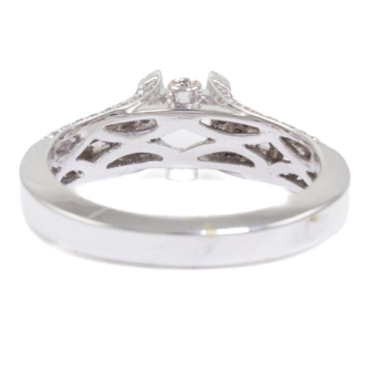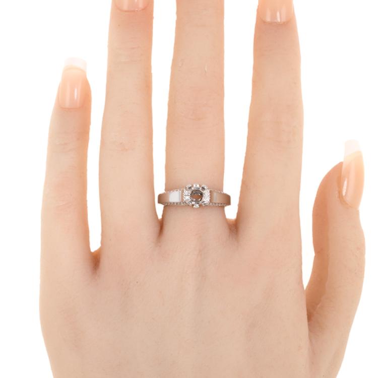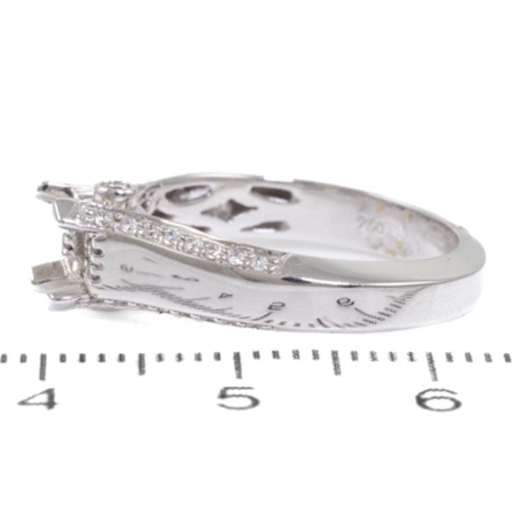18ct white gold 4 claw semi mount ring (note centre stone is not included) for 6.0mm centre round stone. Set with round Natural Diamonds totalling 0.20ct. 18ct white gold. Ring size N. Band width: 3.4mm - 5.2mm. Weight: 5.1g (As New)