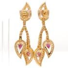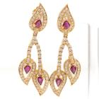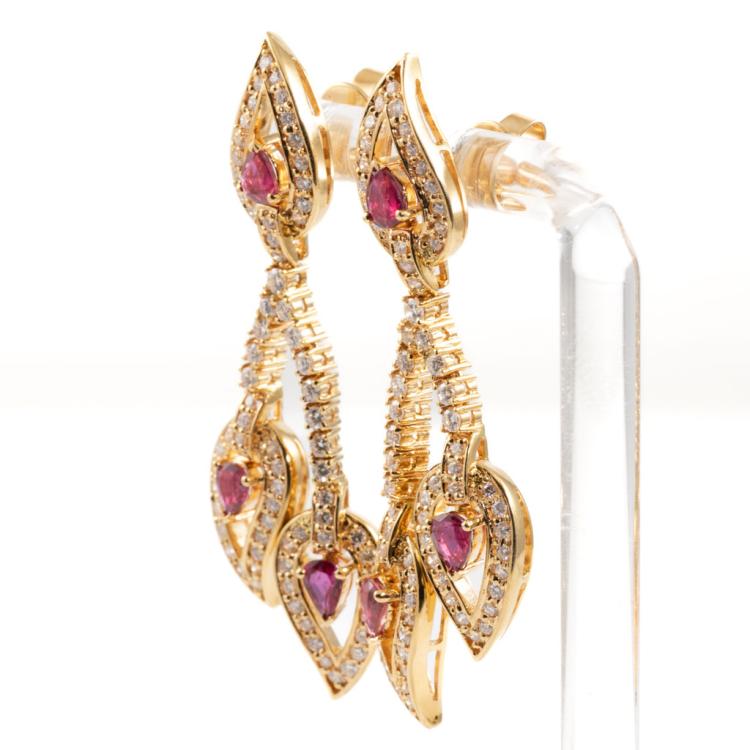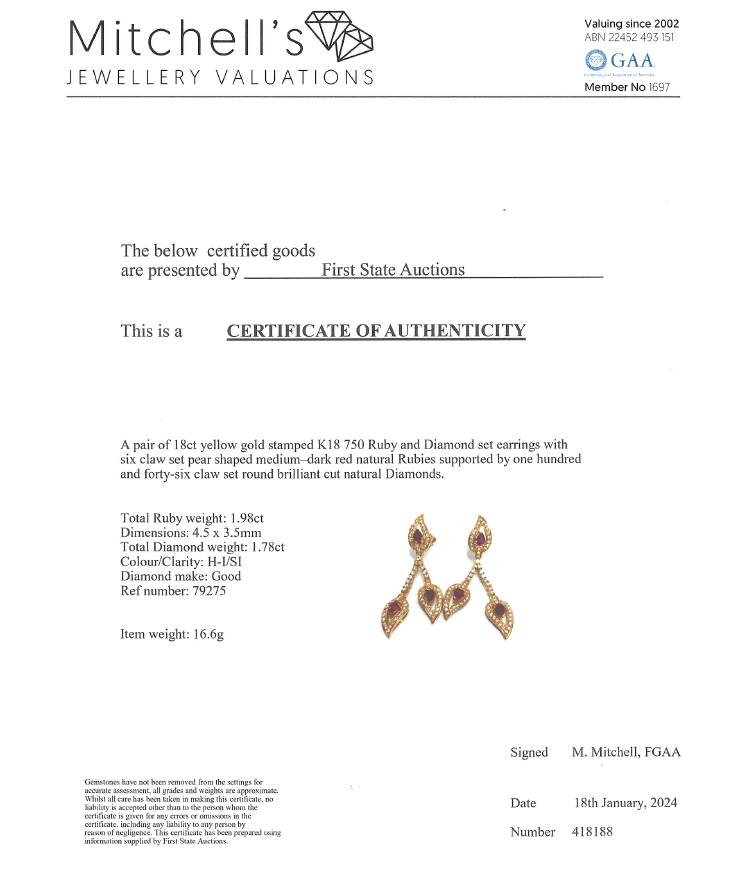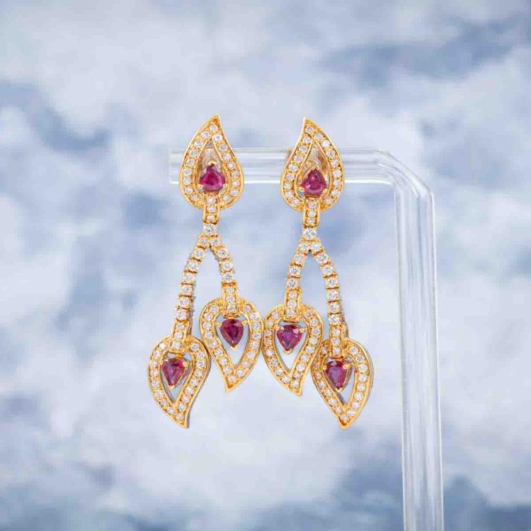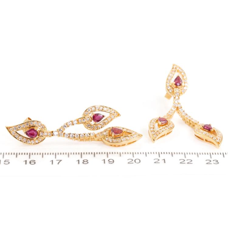 Ruby and Diamond drop earrings with pear shape Natural Rubies totalling 1.98ct and round Natural Diamonds totalling 1.78ct (Estimated grading: H-I SI). 18ct yellow gold. Weight: 16.6g. With Certificate #418188. (Pre-owned)