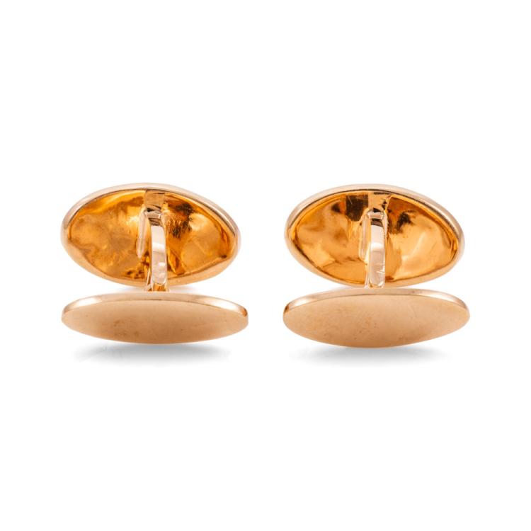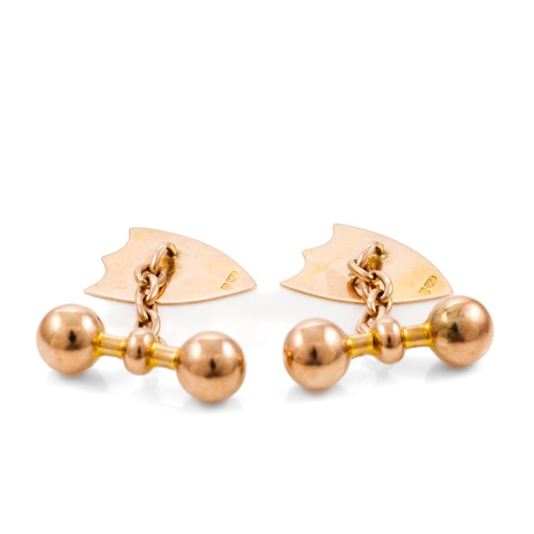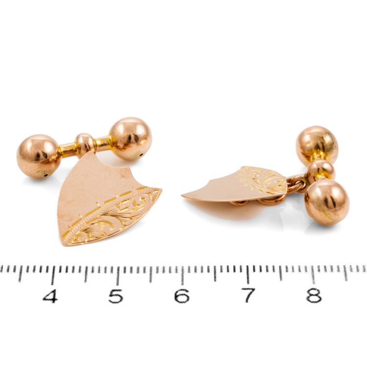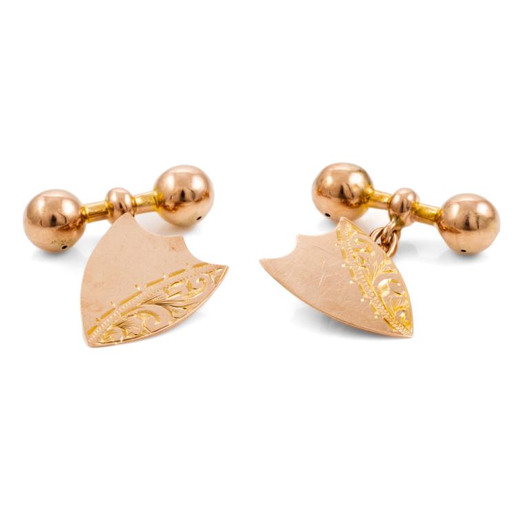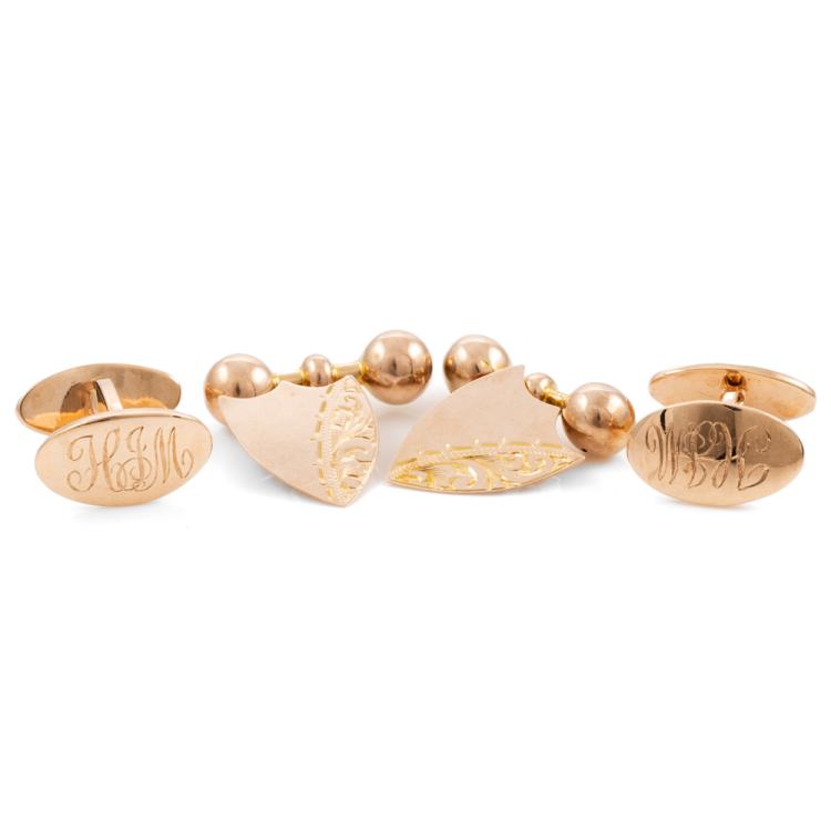 2 Sets of cufflinks. Both 9ct rose gold (one with stamp and other with no stamp. Both XRF tested). One set with engraving: "H & M". Total weight: 13.8g. (Pre-owned)