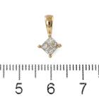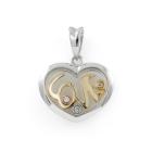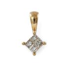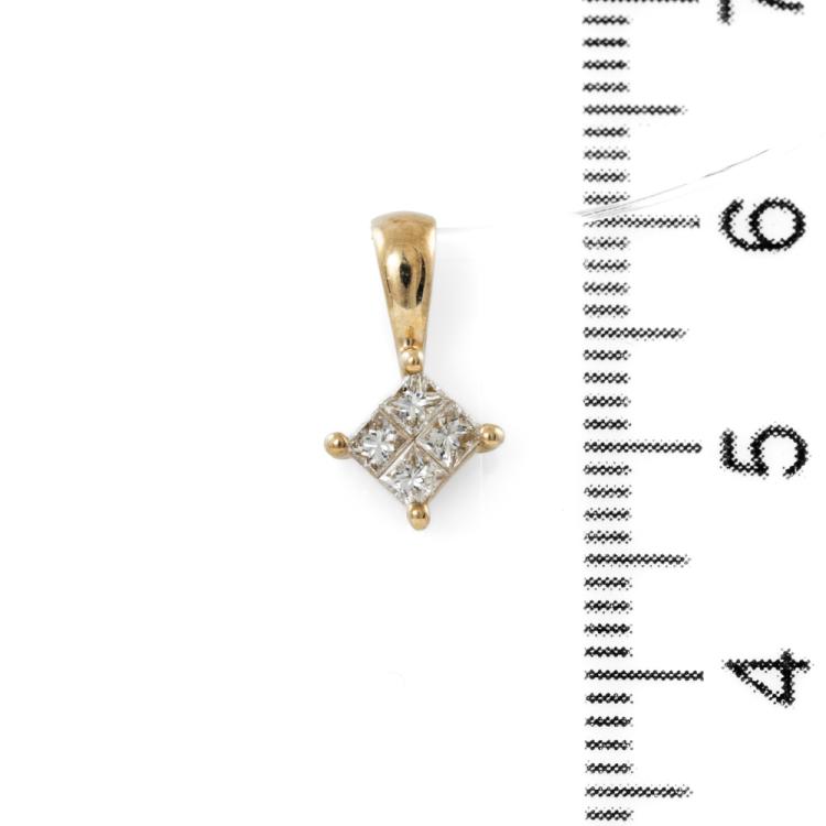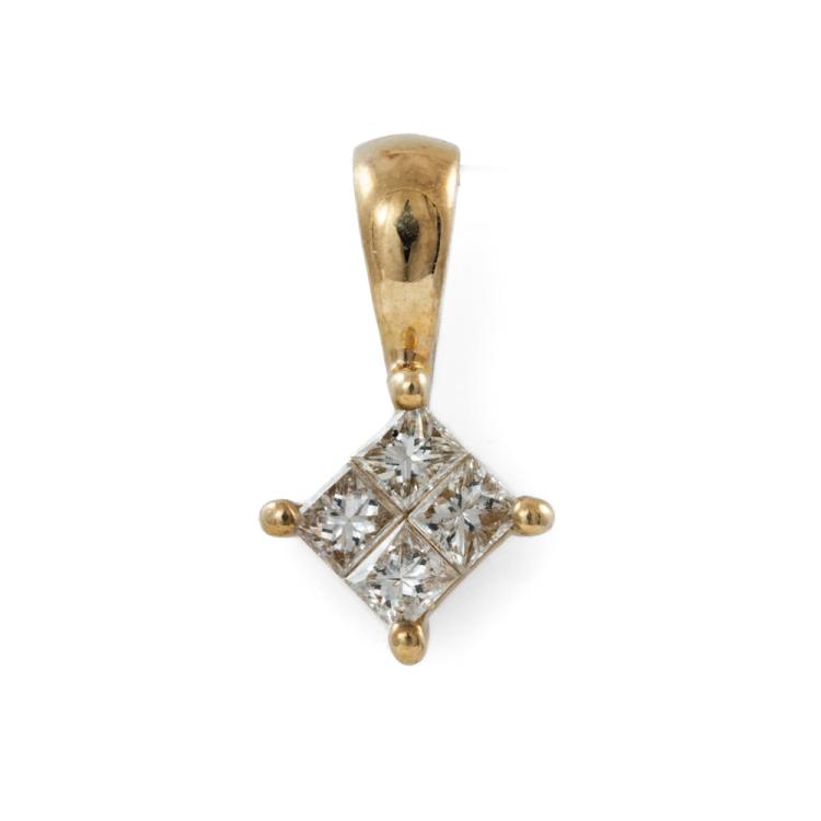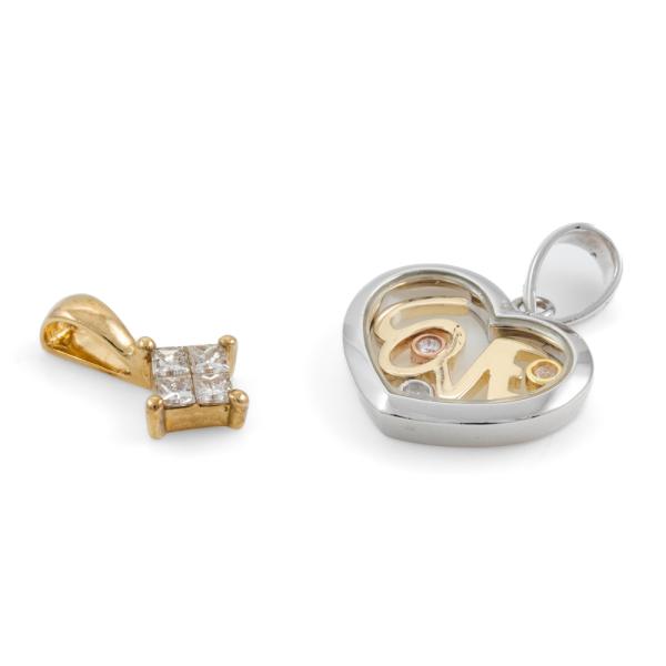 Set of 2 Pendants: 1) Diamond love heart pendant with round floating Natural Diamonds totalling 0.10ct. 9ct white, yellow and rose gold. No chain provided. 2) Diamond pendant with 4 princess cut Natural Diamonds totalling 0.25ct. 9ct yellow gold. Combined weight of 2.7g. (As new)