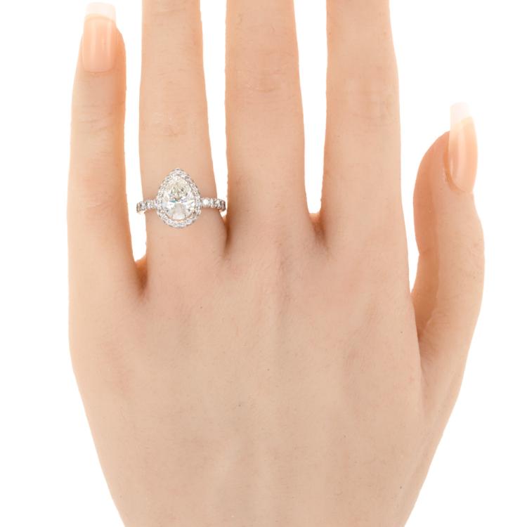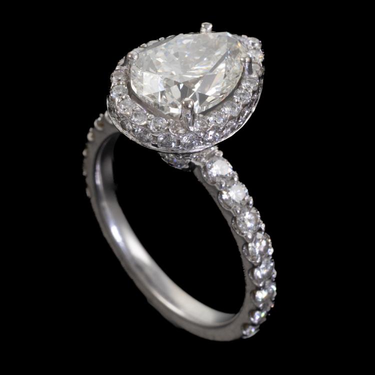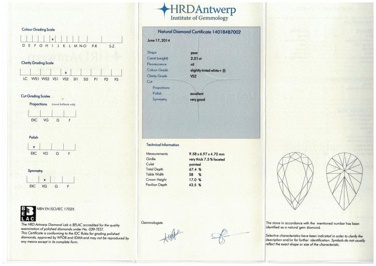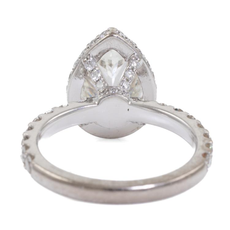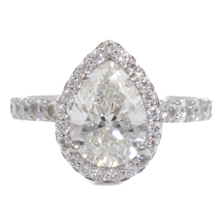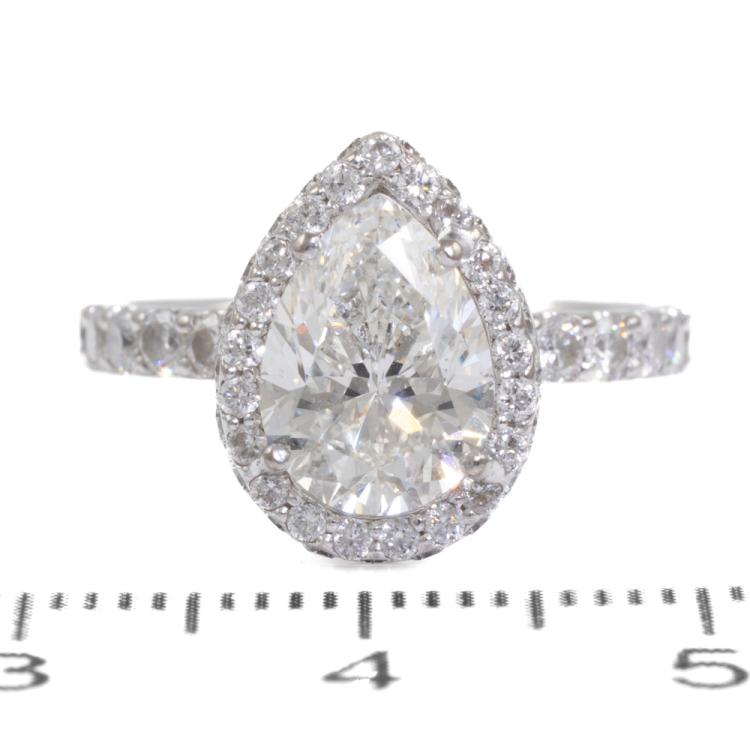 Diamond halo ring with a centre pear shape natural Diamond of 2.01ct (with HRD Certificate graded as I VS2 #14018487002) and remaining round natural Diamonds totalling approximately 0.85ct (Estimated grading: I SI-P1). 18ct white gold. Ring size: I½. Band width: 2.2mm. Weight: 4.9g. (Pre-owned)