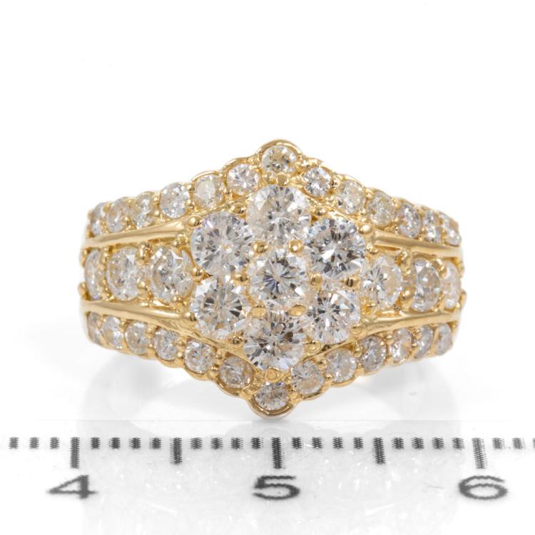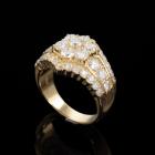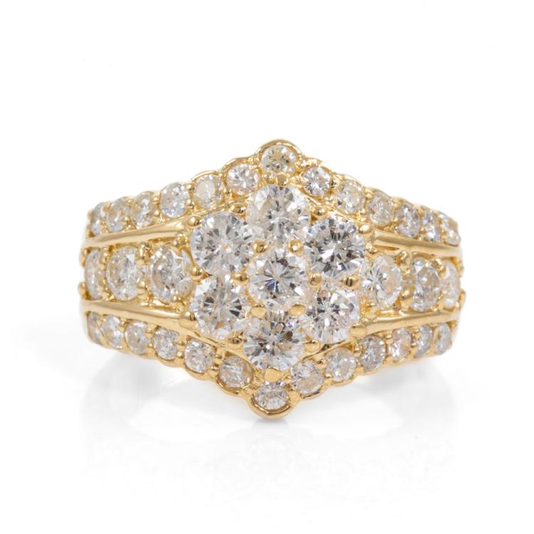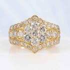 Diamond dress ring with round natural Diamonds totalling 2.04cts (Estimated grading: J-K SI-P1). 18ct yellow gold. Ring size K - ring resizing is not recommended. Band width: 3.3 - 7.1mm. Weight: 9.4g. (Pre-owned)