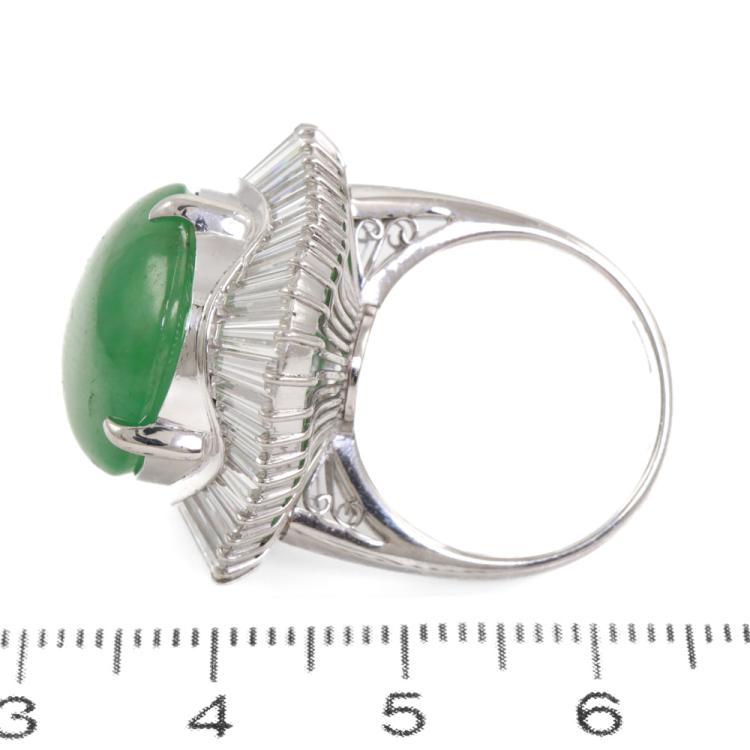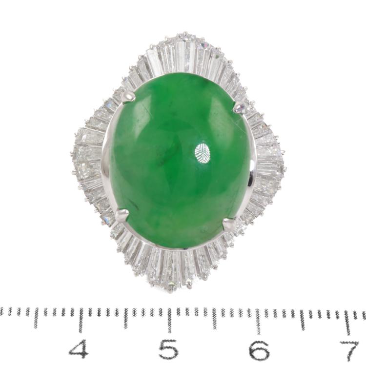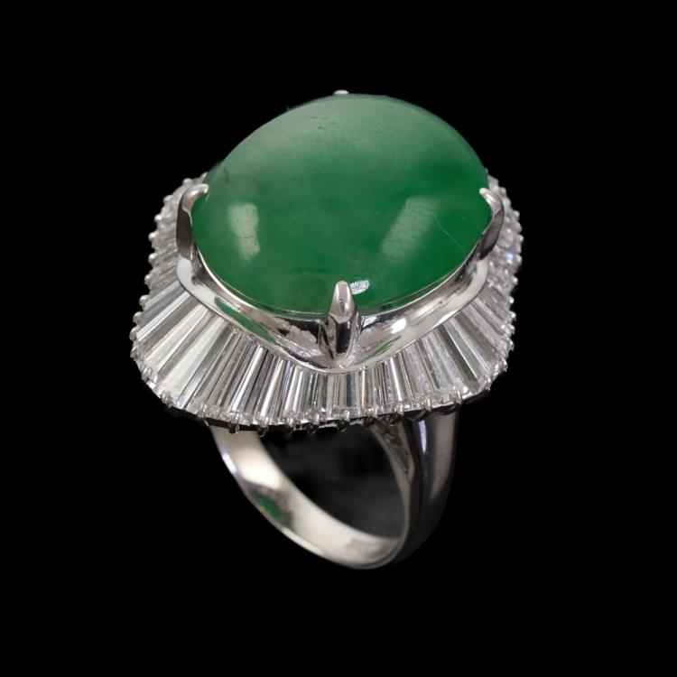 Jade and Diamond ring with cabochon cut oval shape natural Jadeite Jade - Type A of 20.53ct and baguette cut natural Diamonds totalling 3.51ct (Estimated grading: H-I SI). Platinum - 900. Ring size L. Weight: 19.9g. With Certificate #416912. (Pre-owned)