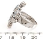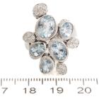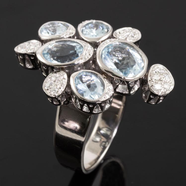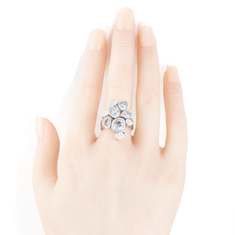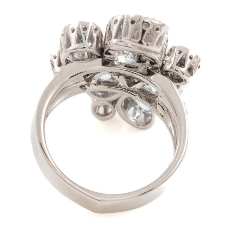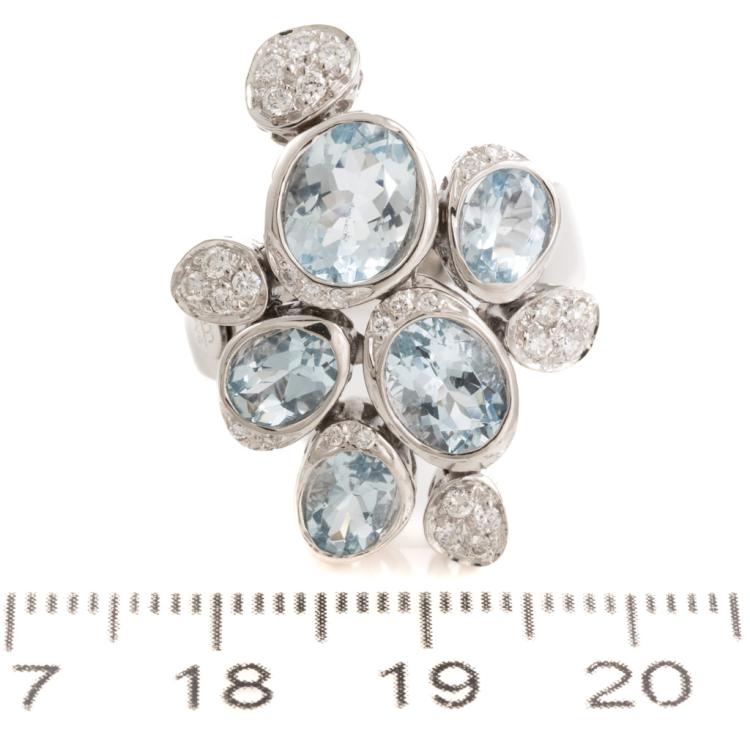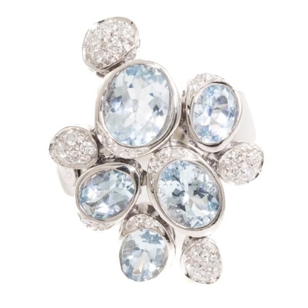 Aquamarine and Diamond ring with 5 oval Natural Aquamarines totalling approximately 2.20cts and round Natural Diamonds totalling approximately 0.18cts. 18ct white gold. Ring size M1/2. Band width: 6.3mm - 3.8mm. Weight: 12.5g. (Pre-owned)