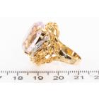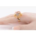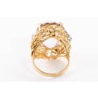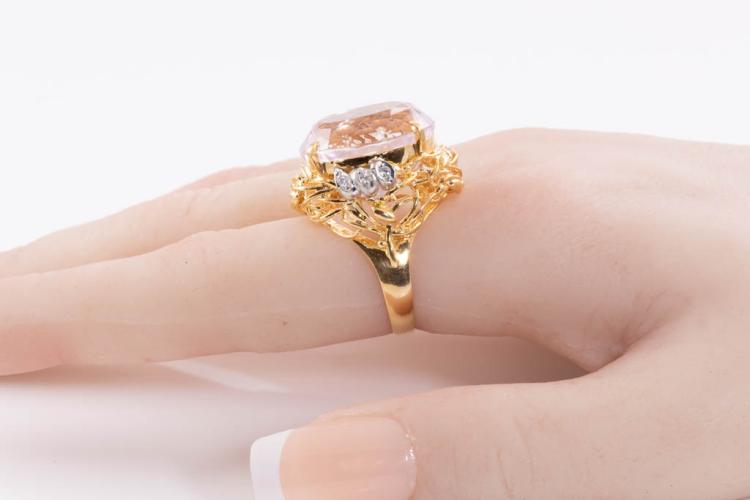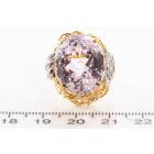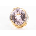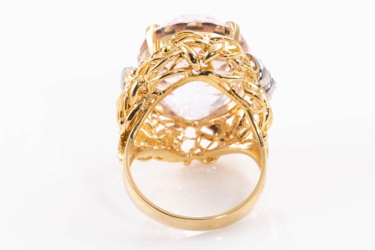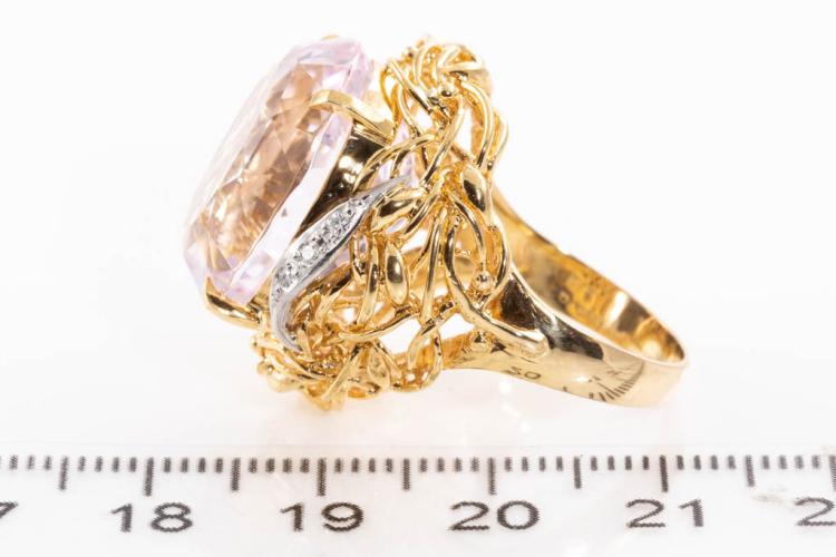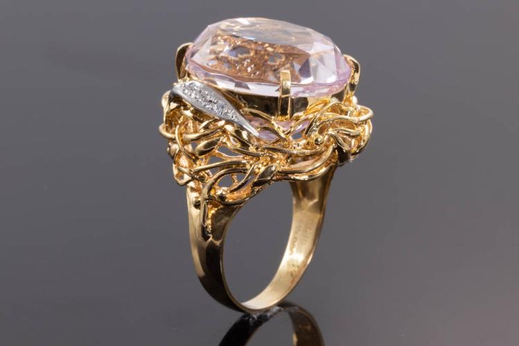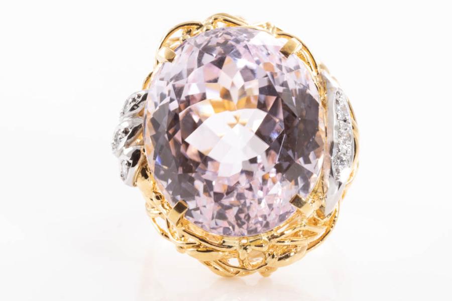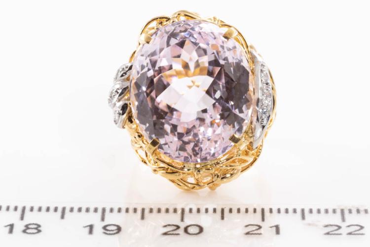 Kunzite and Diamond ring with oval shape Natural Kunzite of 23.55ct and round Natural Diamonds totalling 0.08ct. 18ct yellow gold and platinum. Ring size M. Weight: 14.0g. (Pre-owned)