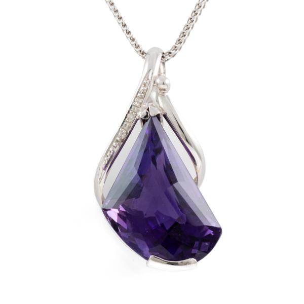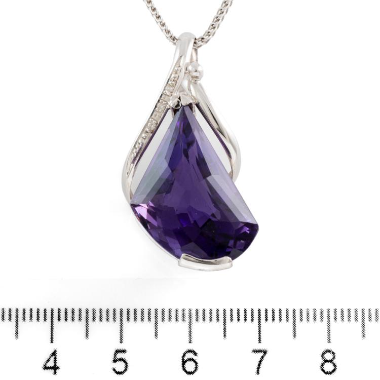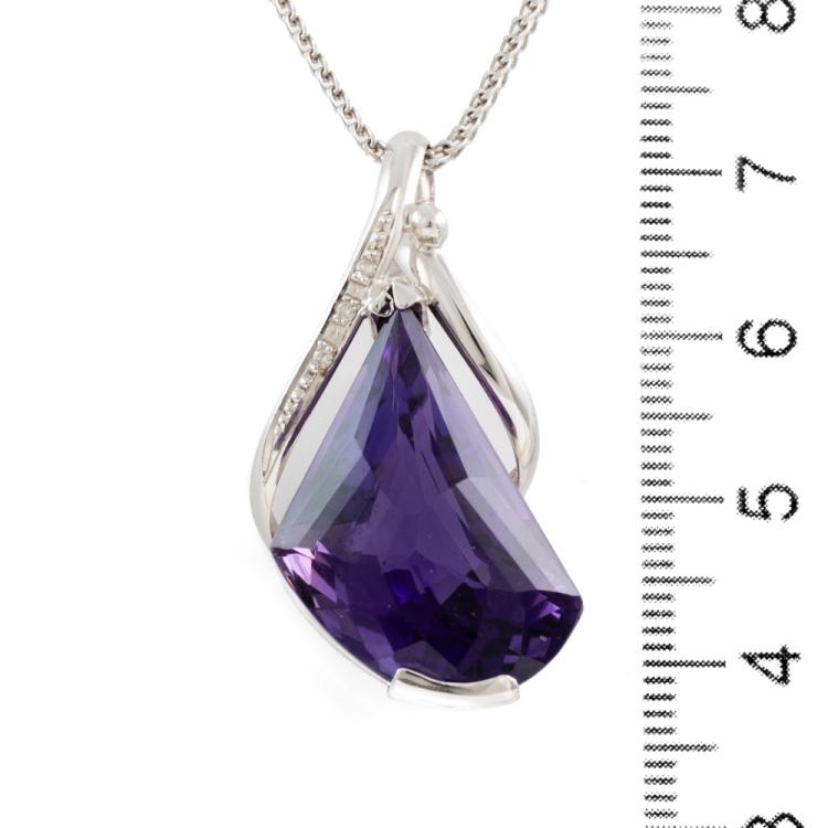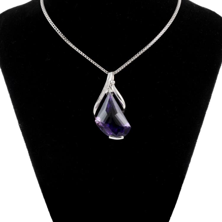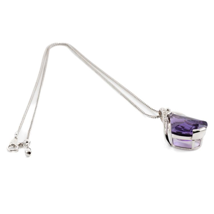 Amethyst and Diamond pendant with a fancy cut natural Amethyst of 23.88ct and round natural Diamonds totalling 0.03cts. 18ct white gold with 18ct white gold adjustable 50cm chain. Weight: 14.8g. (Pre-owned)