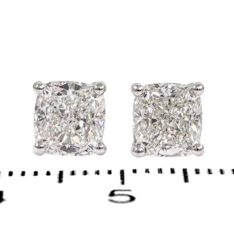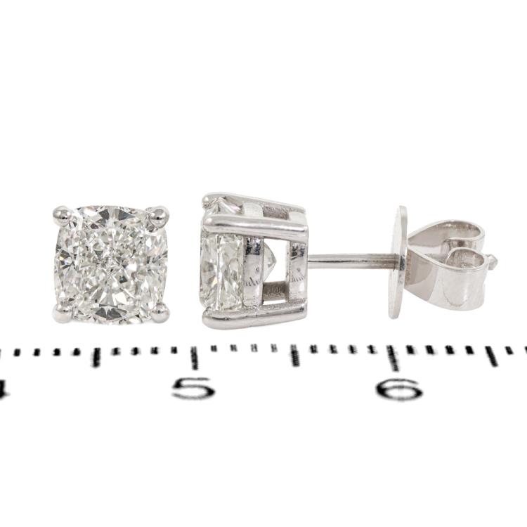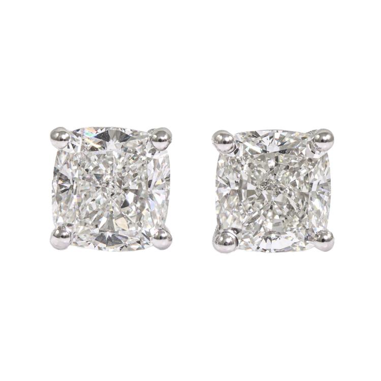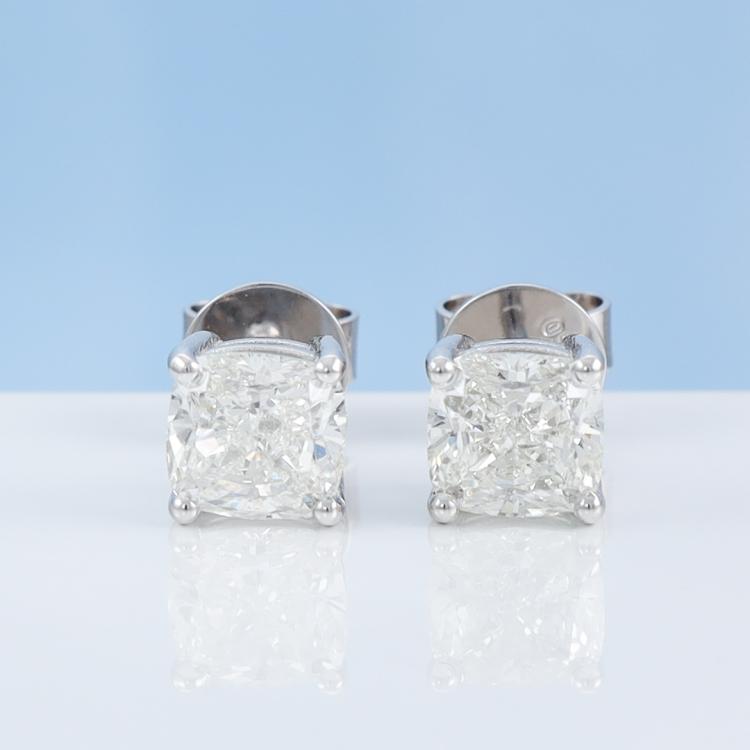 Diamond stud earrings with 2 cushion cut natural Diamonds totalling 2.51ct (both with GIA Reports graded as H VS2 #6234258063 and I VS2 6495098730). 18ct white gold. Weight: 3.1g (New)