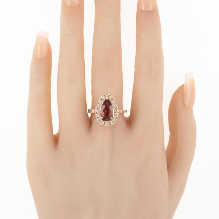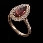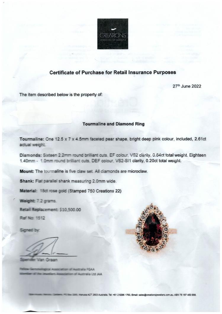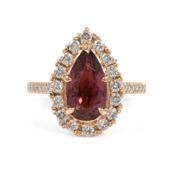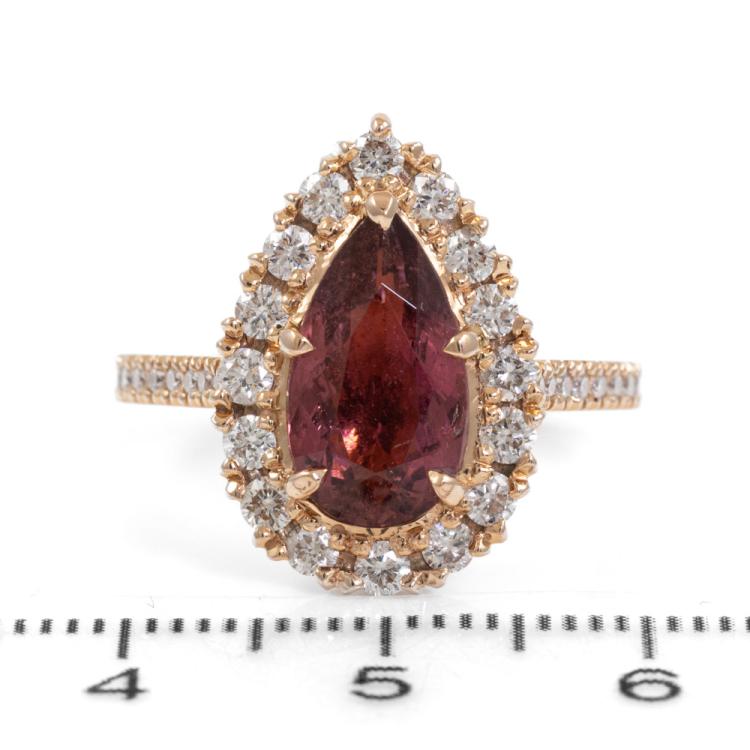 Tourmaline and Diamond ring with a pear shape deep pink natural Tourmaline of 2.61ct and round natural Diamonds totalling 0.84ct (Estimated grading: H-I SI). 18ct rose gold. Ring size O. Band width: 2mm. Weight: 7.2g. With copy of Creations valuation dated 27/07/22 and box. (Pre-owned)