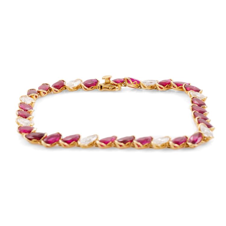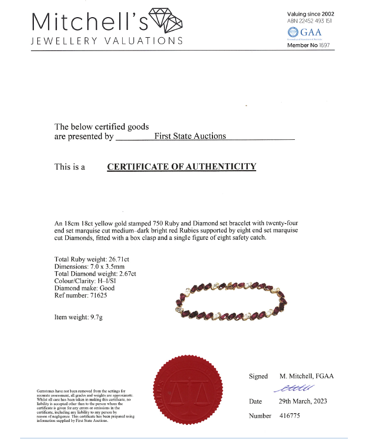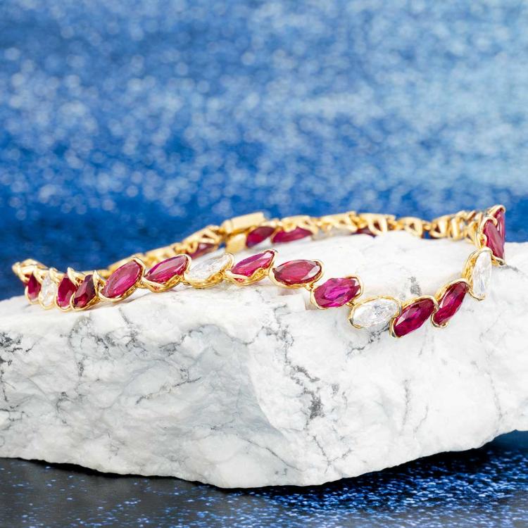 Ruby and Diamond bracelet with marquise cut Natural Rubies totalling 26.71ct and marquise cut Natural Diamonds totalling 2.67ct. 18ct yellow gold. Length: 18cm. Weight: 9.7g. With Certificate #416775. (Pre-owned)