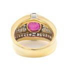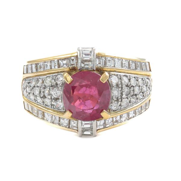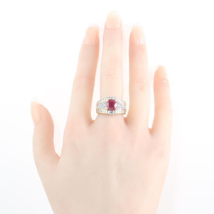 Ruby and Diamond ring with round Natural Ruby of 2.80ct and round, carre & baguette cut Diamonds totalling 1.19ct (Estimated grading: H-I VS-SI). 18ct yellow gold and Platinum-900. Ring size K1/2. Width: 4.8mm - 8mm. Weight: 11.9g. With Certificate #419750. (Pre-owned)