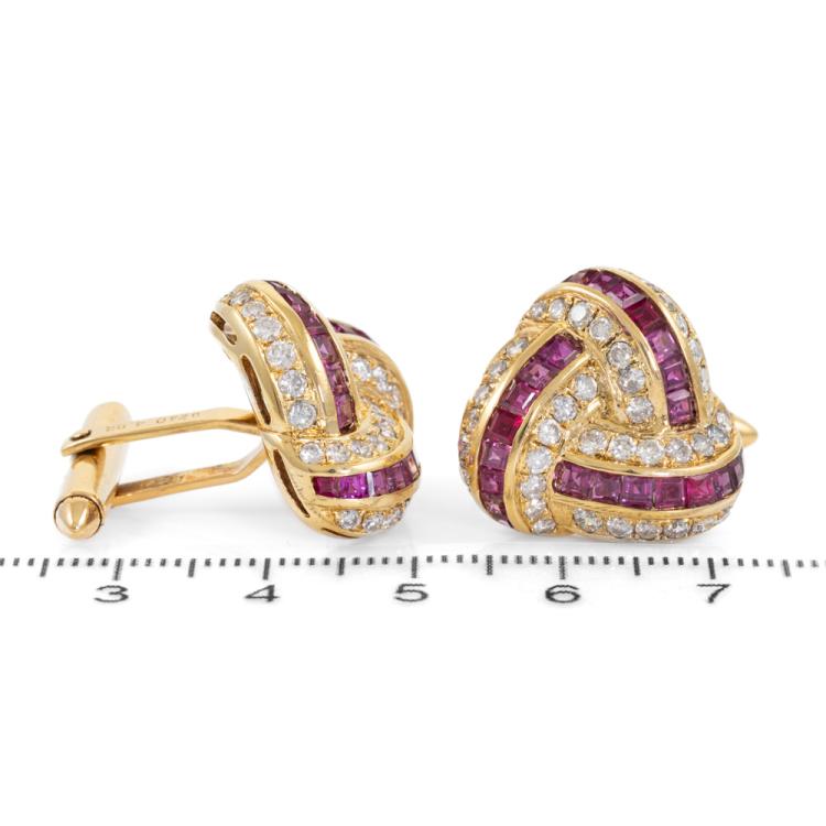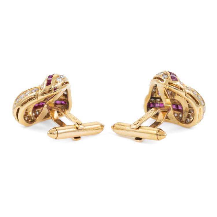 Ruby & Diamond cufflinks with carre cut natural Rubies totalling approximately 2.80ct and round natural Diamonds totalling 2.40ct (Estimated grading: H SI). Motif size: approximately 20mm X 20mm. 18ct yellow gold. Weight: 18.9g. With Certificate #418671. (Pre-owned)