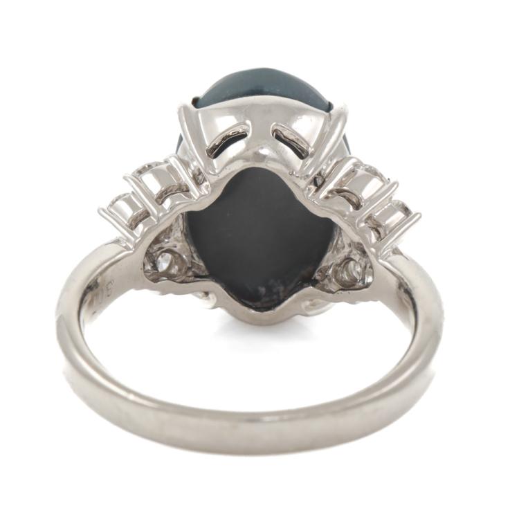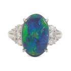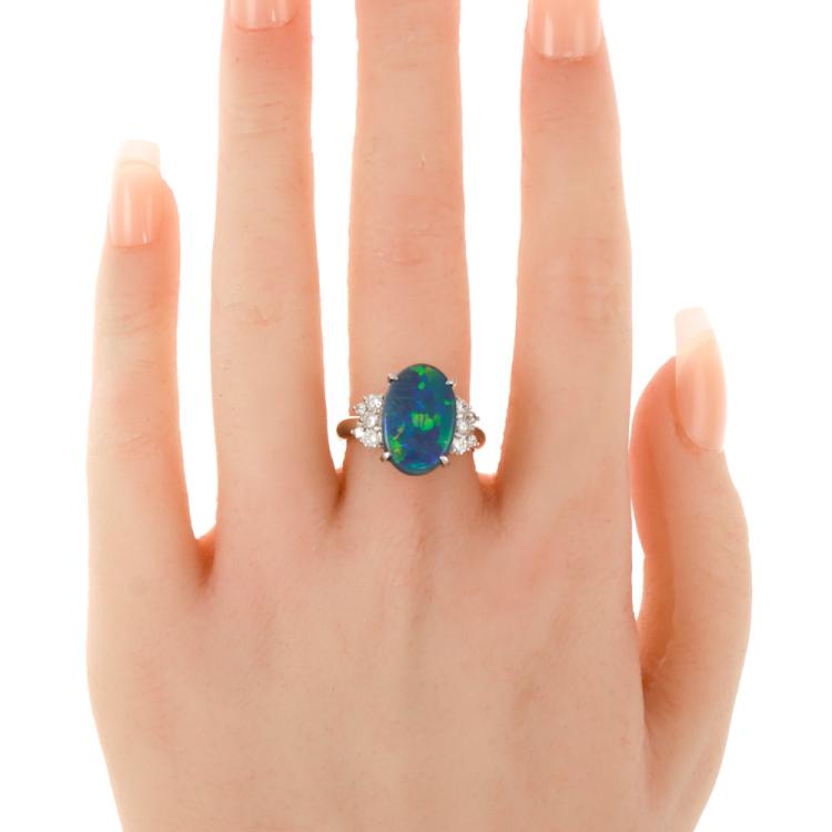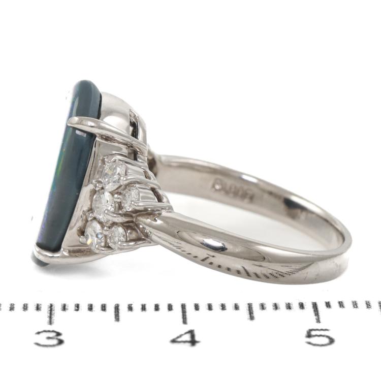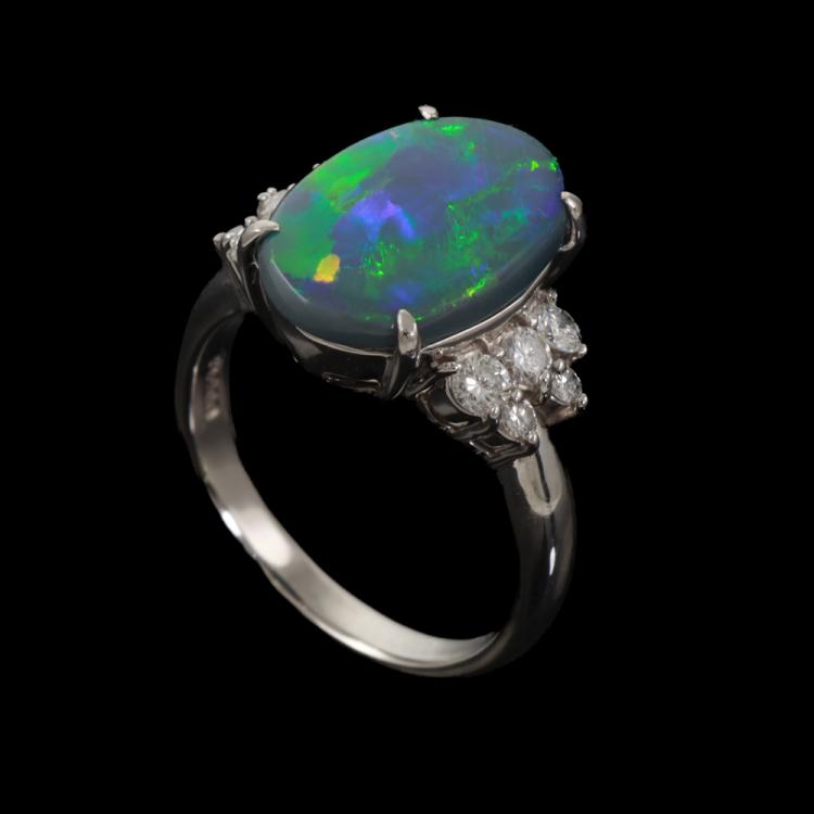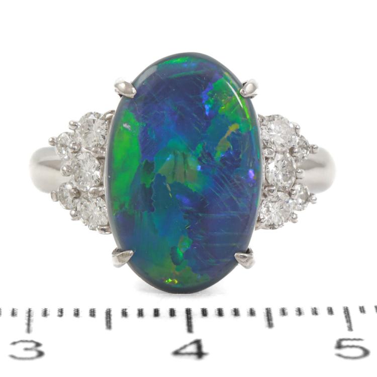 Opal and Diamond ring with solid Natural Black Opal of 3.07ct and round Natural Diamonds totalling 0.48ct (Estimated grading: G-H SI). Platinum - 900. Ring size N. Band width: 2.5mm - 2.8mm. Weight: 8.2g. (Pre-owned)