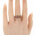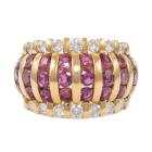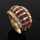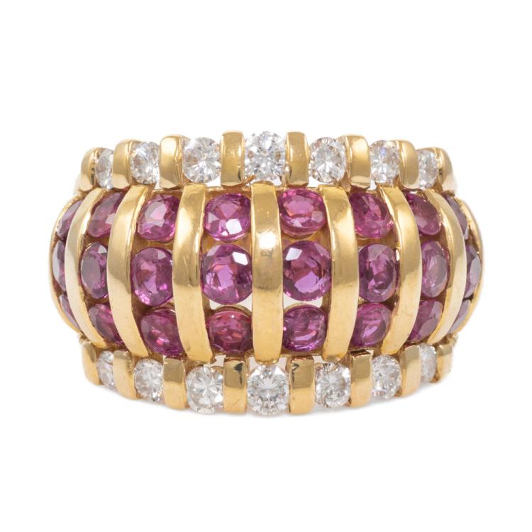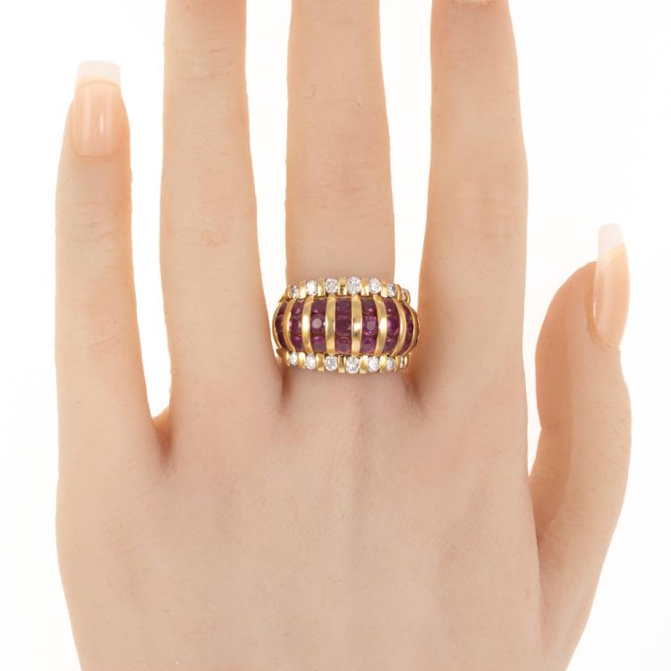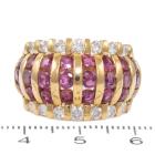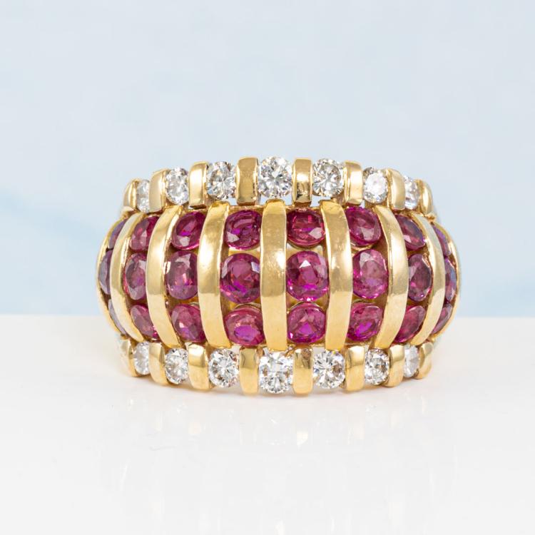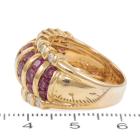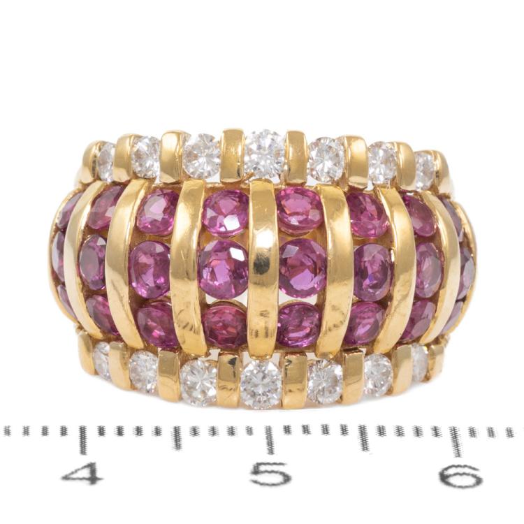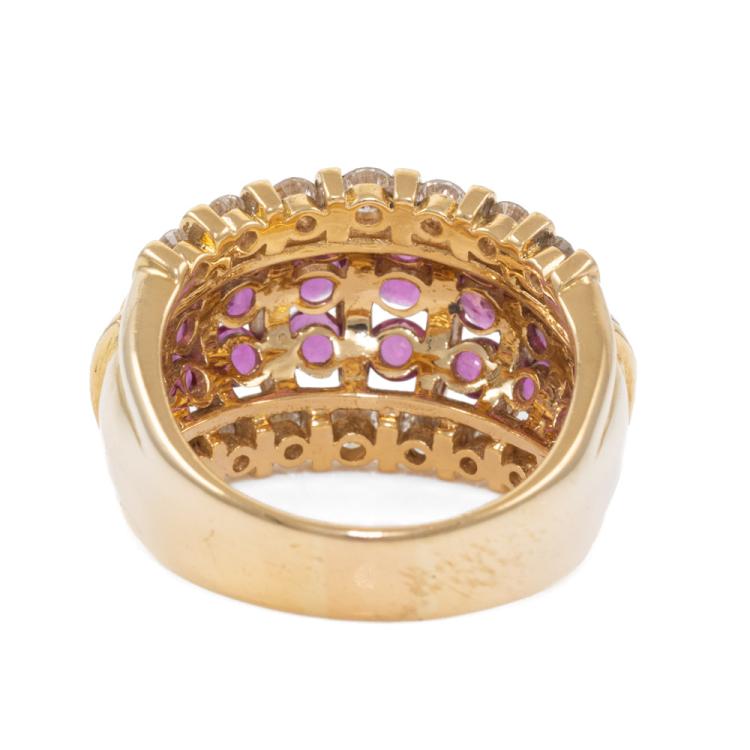 Ruby and Diamond ring with round Natural Rubies totalling 3.21ct and round Natural Diamonds totalling 0.77ct. (Estimated grading: G-H SI). 18ct yellow gold. Ring size: M1/2 - ring resizing is not recommended. Band width: 5.0mm -10.3mm. Weight: 12.7g. (Pre-owned)