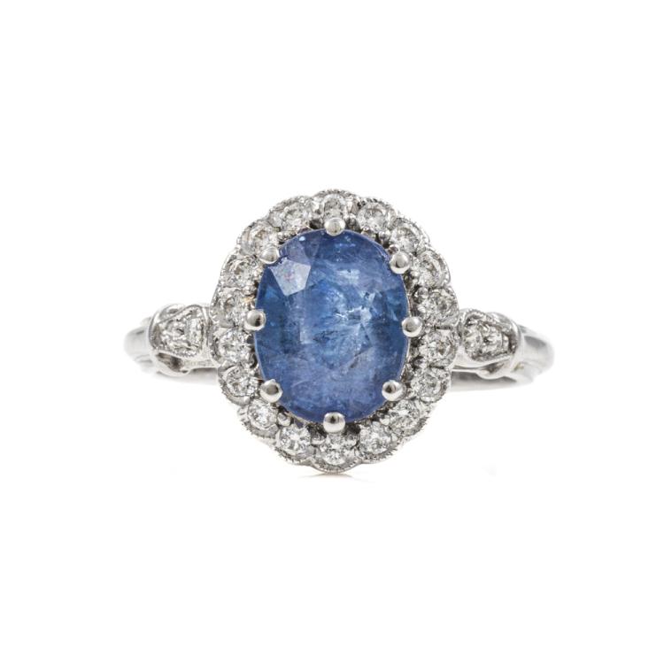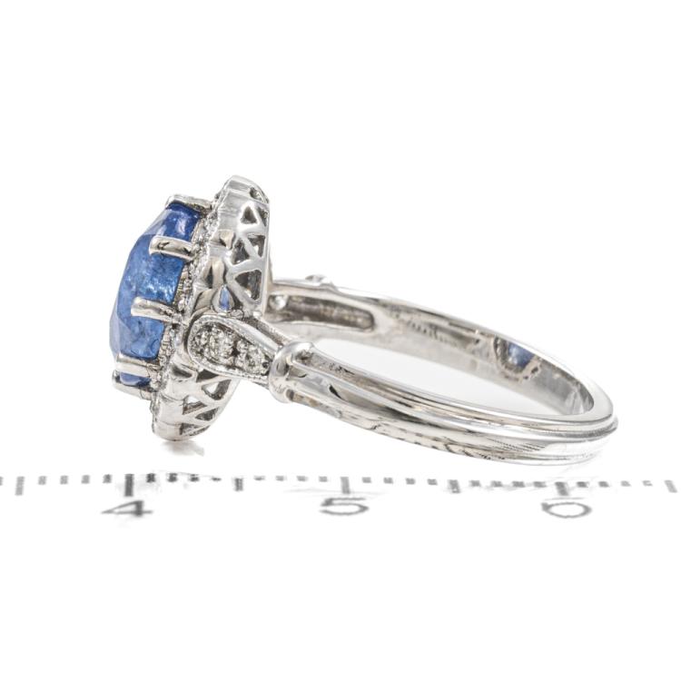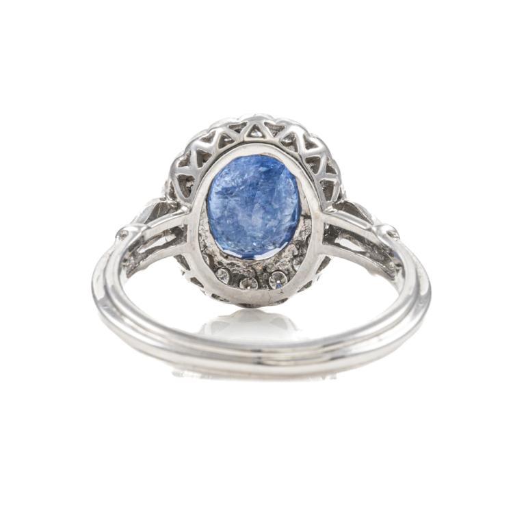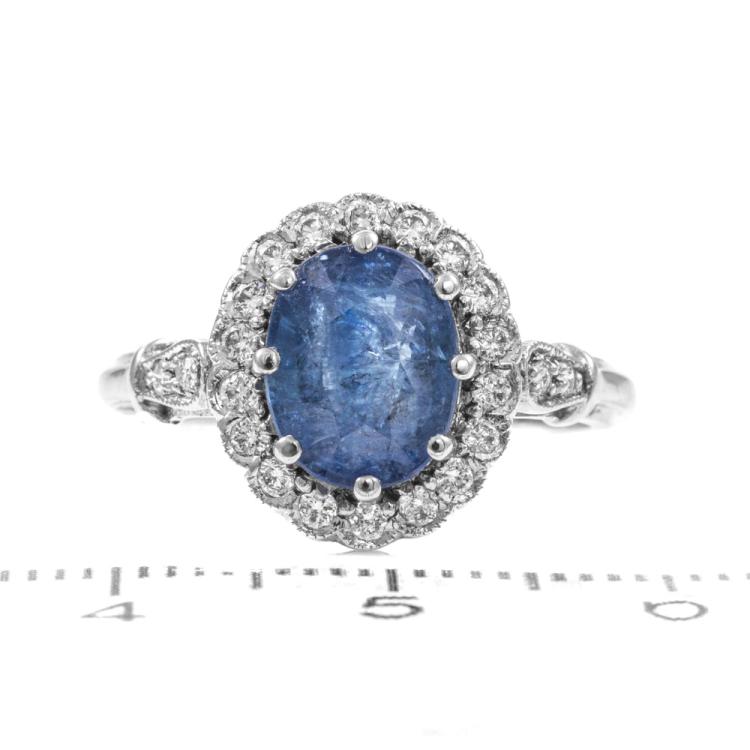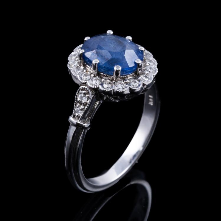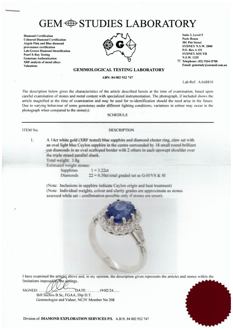 Sapphire and Diamond ring with an oval shape blue Ceylon Natural Sapphire of 3.22ct and round Natural Diamonds totalling 0.30cts (Estimated grading: G-H VS SI). 14ct white gold. Ring size M1/2. Band width: 2.3mm-2.6mm. Weight: 3.8g. With GSL Certificate #AA68810. (As new)