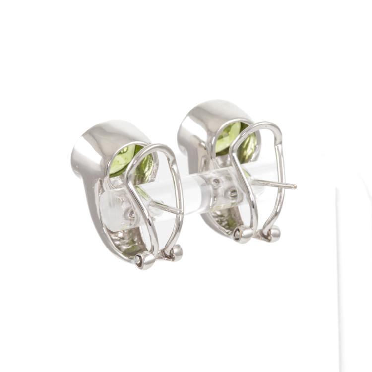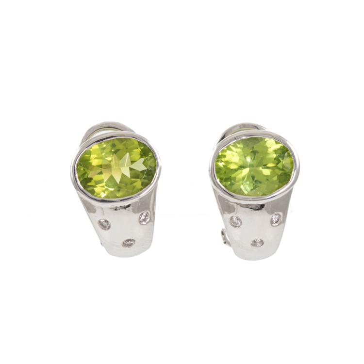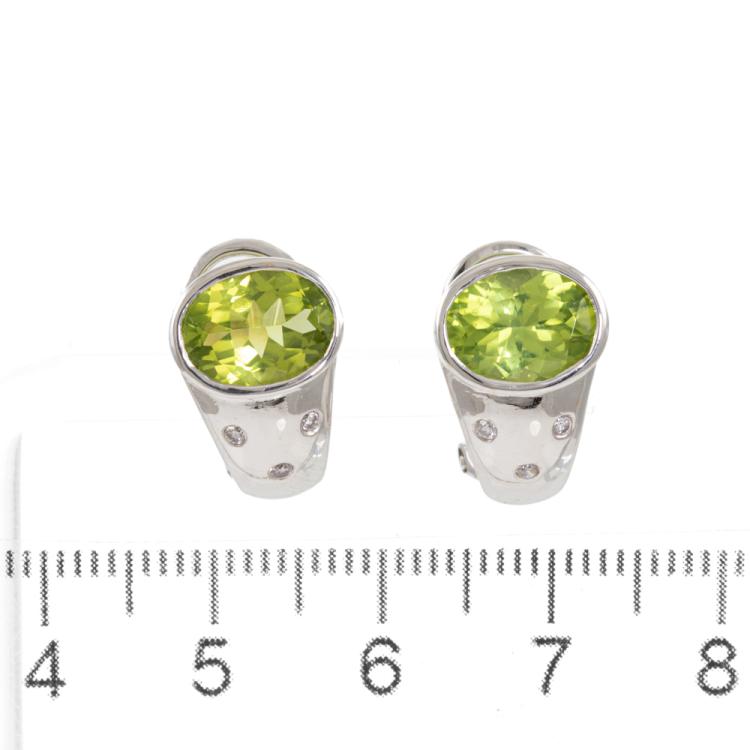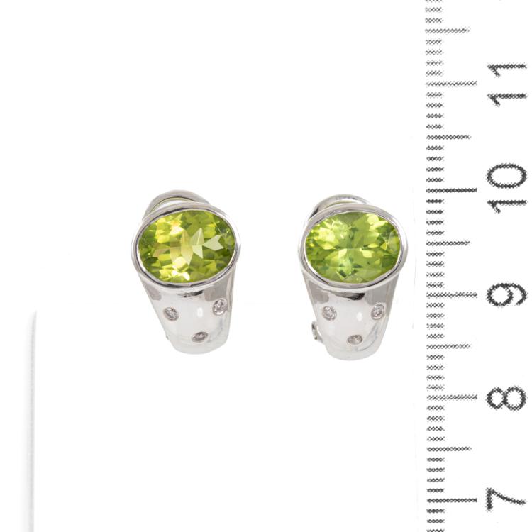 Peridot and Diamond clip-on earrings (for pierced ears) with oval natural Peridot totalling 3.50ct and round natural Diamonds totalling 0.08ct. 18ct white gold. Weight: 6.6g. (Pre-owned)
