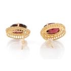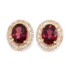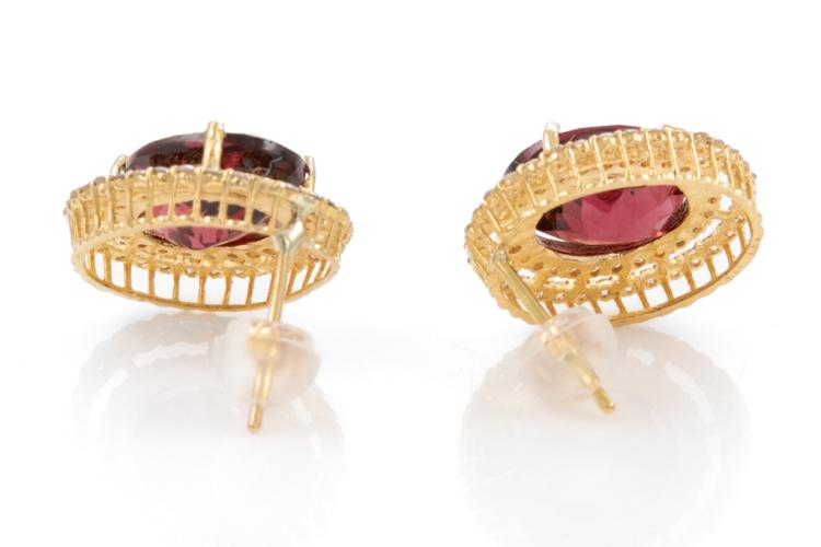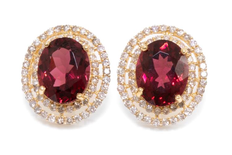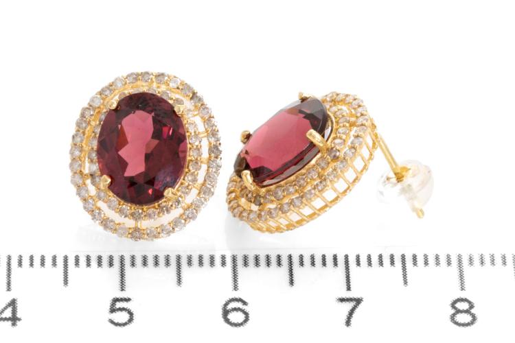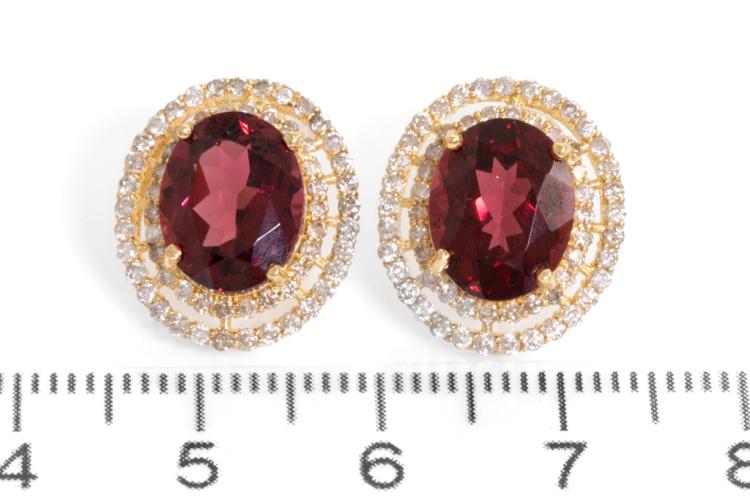 Garnet and Diamond earrings with oval Rhodolite Natural Garnet totalling 3.60ct and round Natural Diamonds totalling 0.40ct (Estimated grading: I-J P1-P2). 18ct yellow gold with 18ct yellow gold & silicon backs. Weight: 4.4g. (Pre-owned)