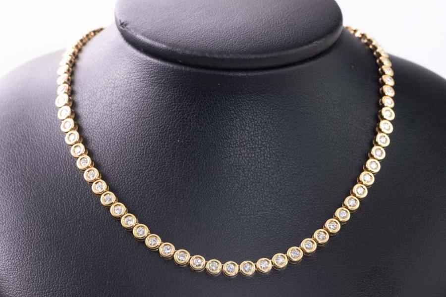 Diamond tennis necklace with round natural Diamonds totalling 3.79ct (Estimated grading: I-J SI). 18ct yellow gold. Length: 41cm. Weight: 24.0g. With Certificate #417267. (Pre-owned)