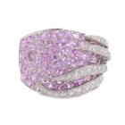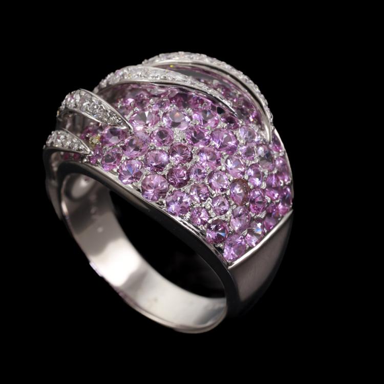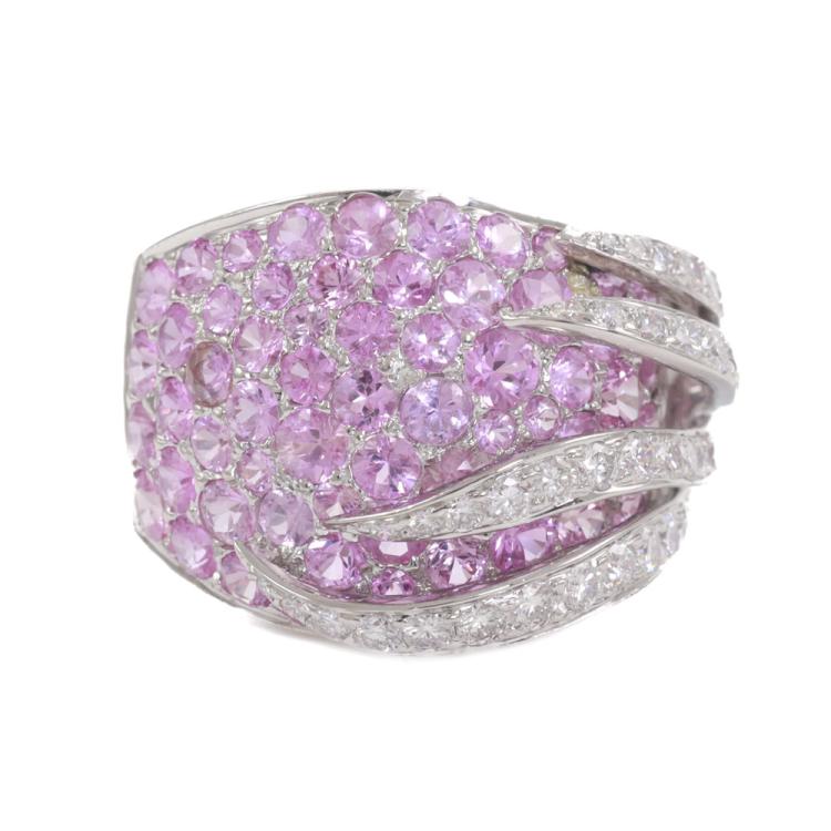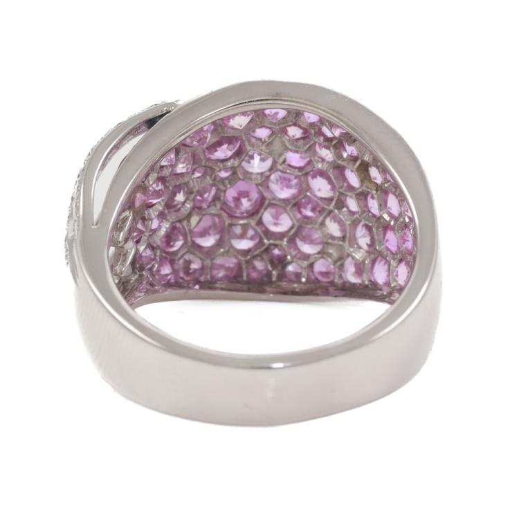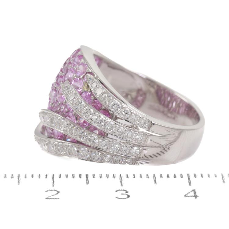 Sapphire and Diamond ring with round pink Natural Sapphires totalling 3.92ct and round Natural Diamonds totalling 0.79ct (Estimated grading: G-H SI). 18ct white gold. Ring size: O. Band Width: 4.8mm - 6.8mm. Weight: 9.8g. (Pre-owned)