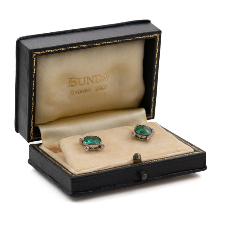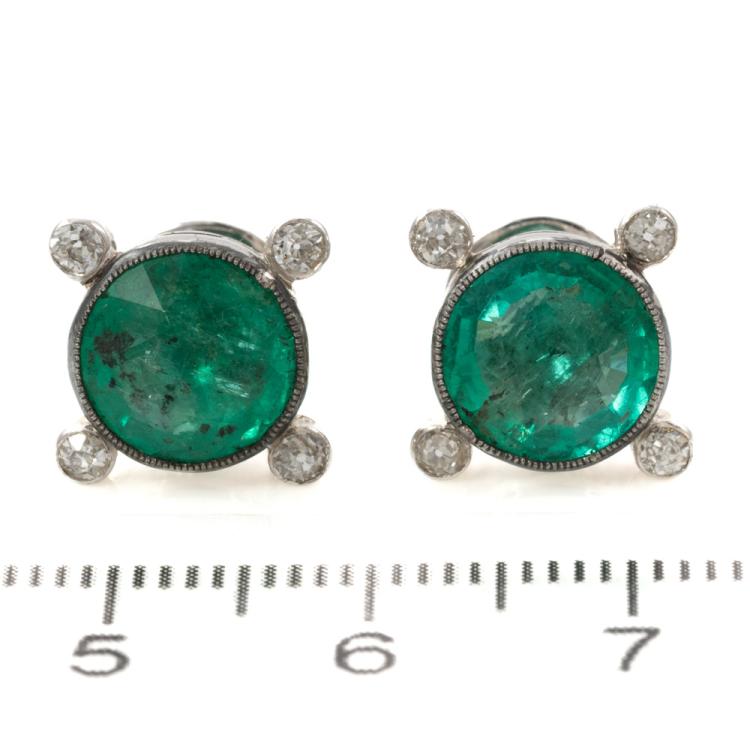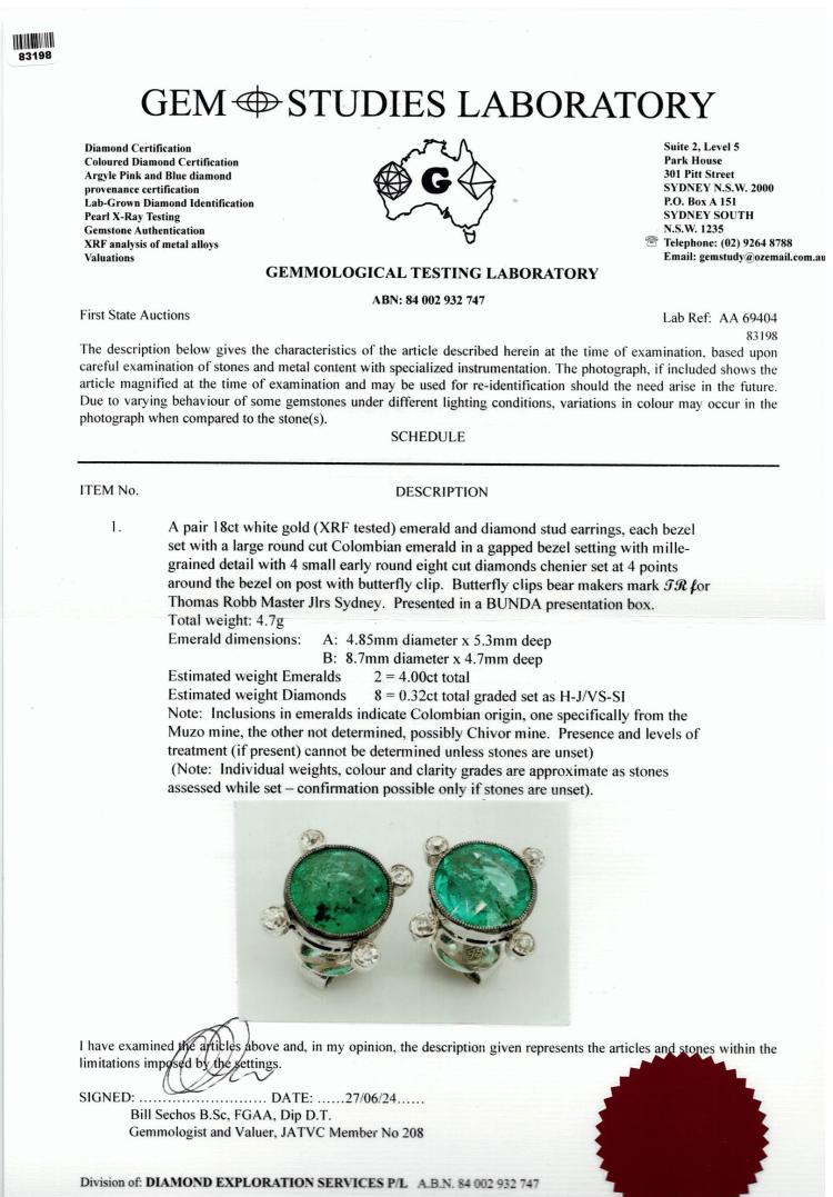 Emerald and Diamond earrings with 2 round natural Colombian Emeralds totalling 4.00ct (With GSL Description Report #AA69404. Origin: Colombia - One Emerald from Muzo mine and the other Emerald possibly Chivor mine) and 8 round natural Diamonds totalling 0.32ct (Estimated grading H-J VS-SI). 18ct white gold. Weight: 4.7g. With Bunda box. (Pre-Owned)