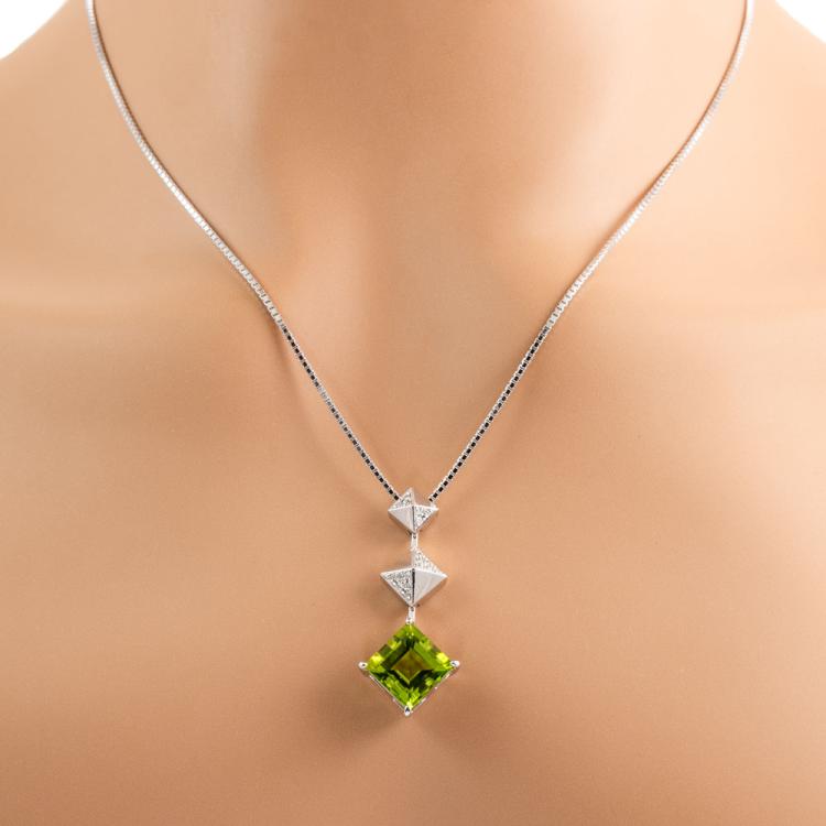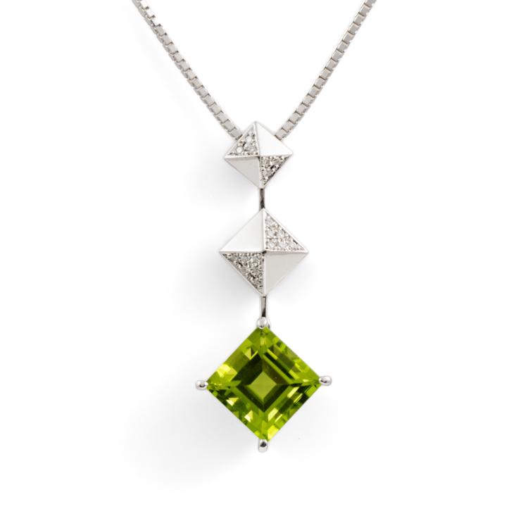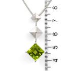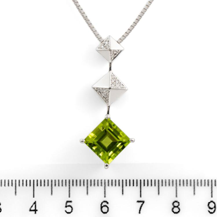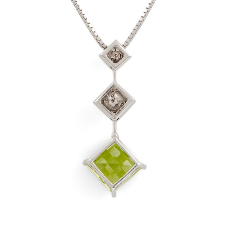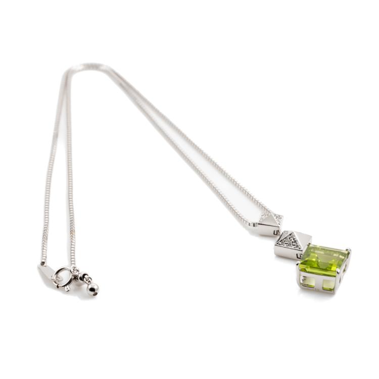 Peridot and Diamond pendant with natural carre cut Peridot of 5.30ct and natural Diamonds totalling 0.11cts. 18ct white gold with 18ct white gold adjustable 45.0cm chain. Weight: 11.6g. (Pre-owned)