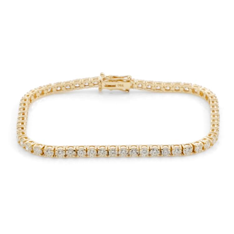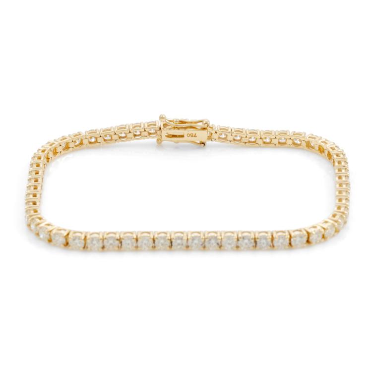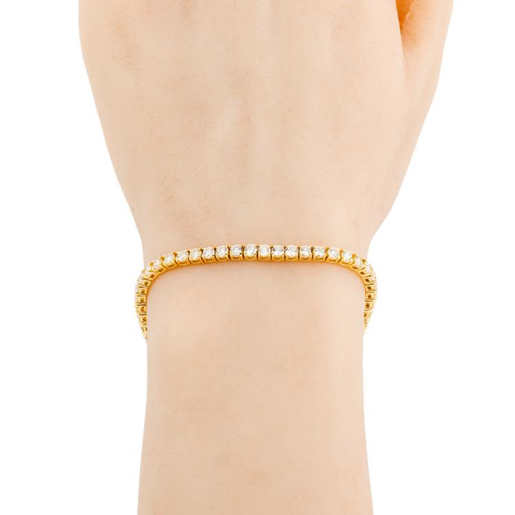Diamond tennis bracelet with 57 round brilliant cut Natural Diamonds totalling 5.98ct (Estimated grading: J-K VS). 18ct yellow gold. Length: 18cm. Weight: 10.7g. With Valuation Certificate #418445. (New)