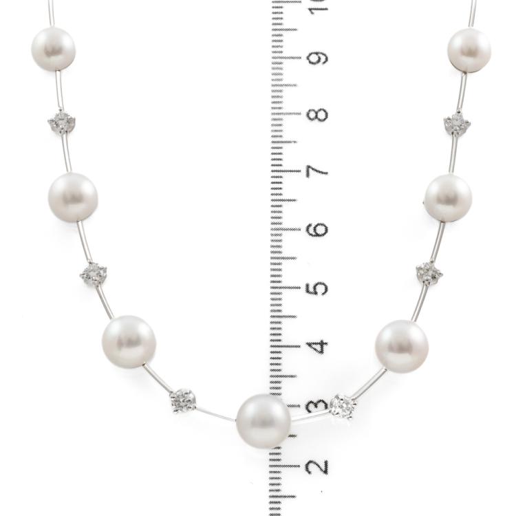 Stephen Hafner Pearl necklace with 13 Akoya Pearls of 6.2mm-9.1mm and 17 round natural Diamonds totalling 1.91ct (Estimated grading H-J VS-SI). 18ct white gold clasp. Length: 38.5cm. Weight: 27.3g. Valuation Certificate: #418982. (Pre-owned)