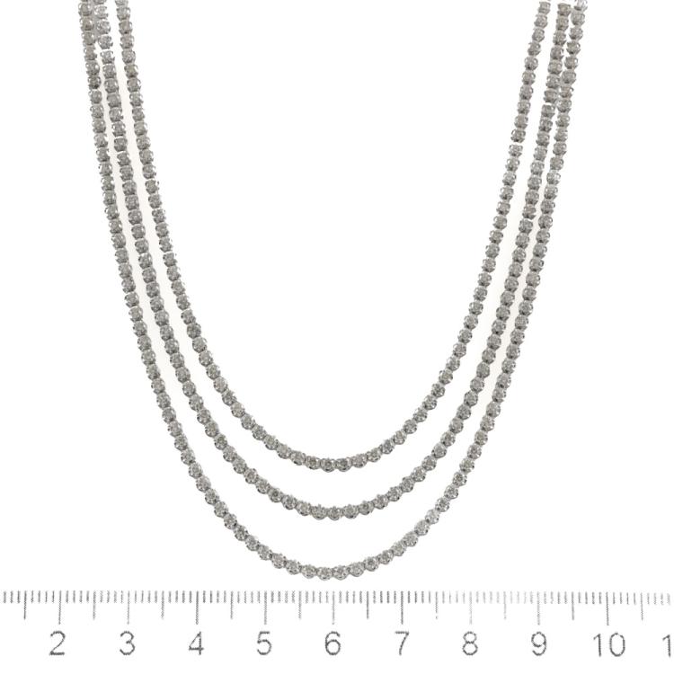 Diamond 3 row tennis necklace with 389 round brilliant cut Natural Diamonds totalling 6.82ct (Estimated grading: I-J SI). 14ct white gold. Length: 41cm. Weight: 19.5g. With Valuation Certificate #419131. (New)