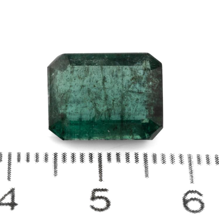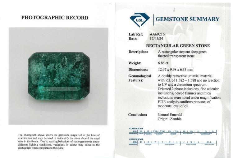 A loose rectangular step cut deep green Zambian natural Emerald of 6.86ct (with GSL summary #AA69216). (As new)
