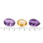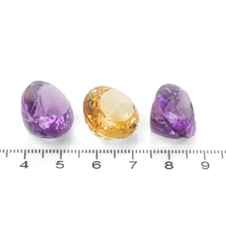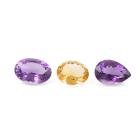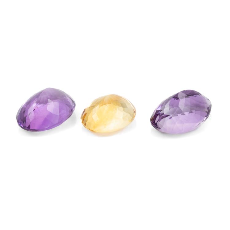 A parcel of 3 Loose mixed Quartz totalling 73.01ct. one oval cut natural Citrine of 21.34ct, size: 20.66mm x 17.11mm x 10.53mm. Two natural Amethysts with one oval shape Amethyst of 27.12ct, size 23.94mm x 16.88mm x 11.57mm and one pear shape Amethyst of 24.53ct, size 23.57mm x 16.30mm x 12.47mm). (New)