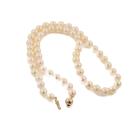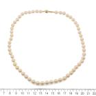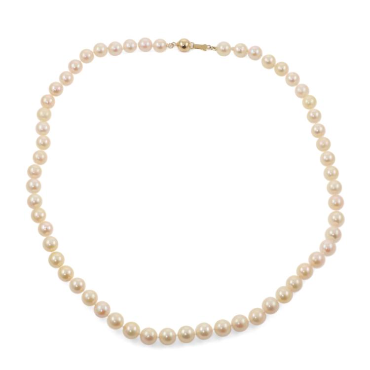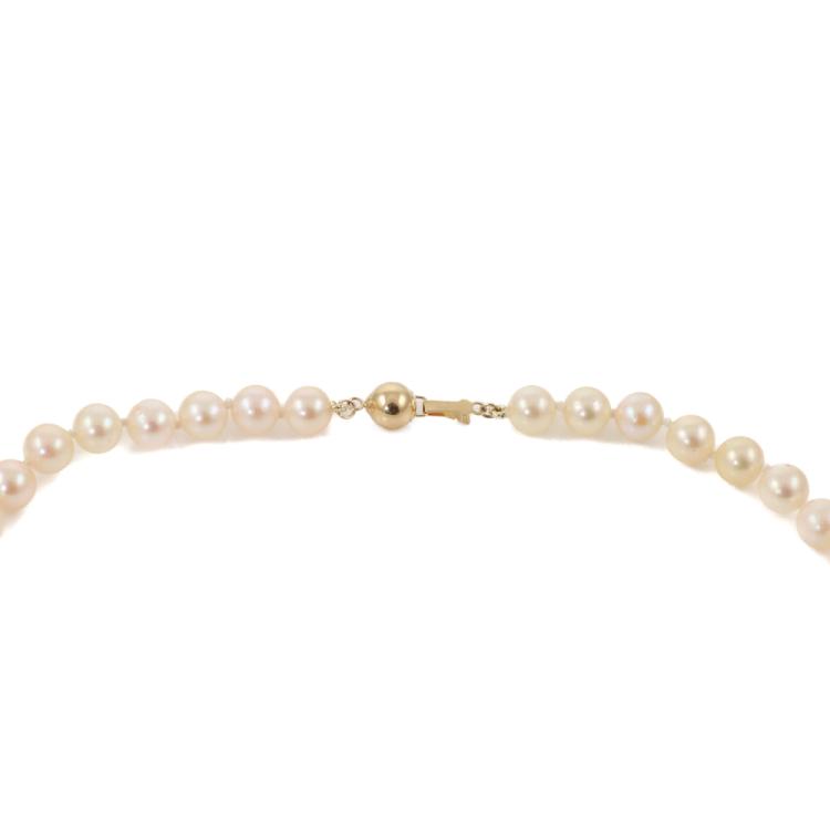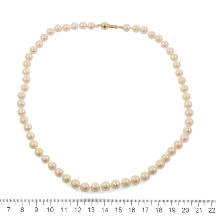 Pearl necklace with 57 Akoya Pearls of 7.4mm - 7.0mm. 14ct yellow gold ball clasp of 7mm. Length: 46cm. Weight: 30.2g. (Pre-owned)