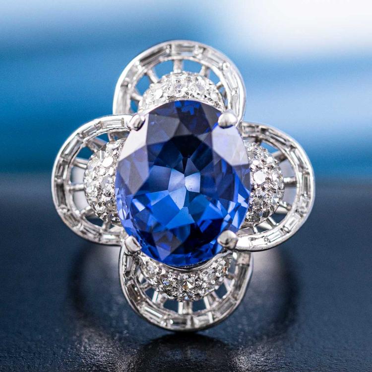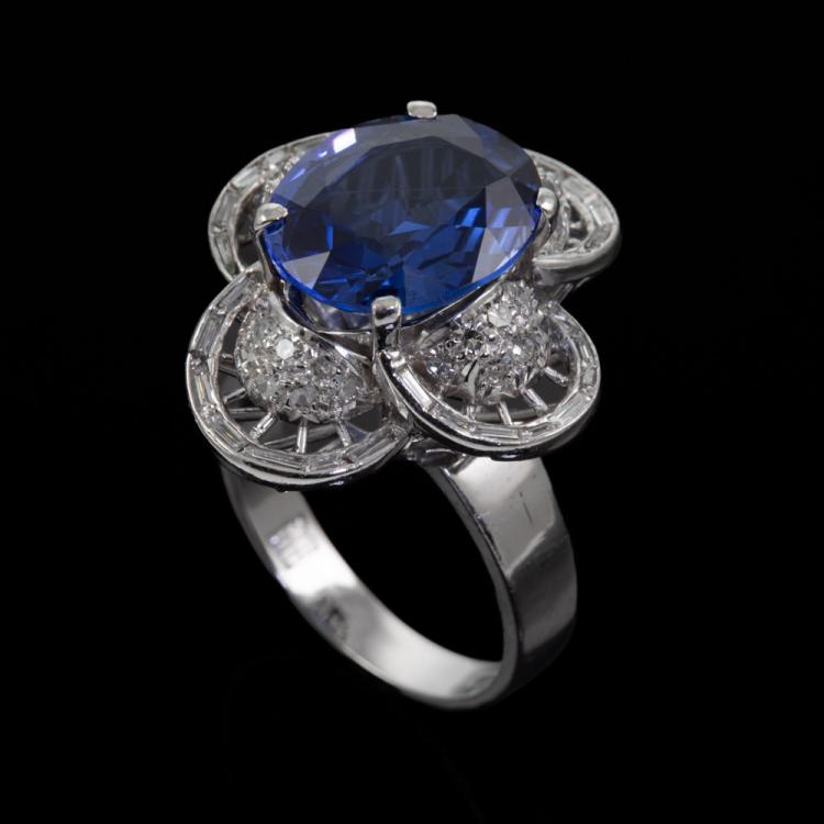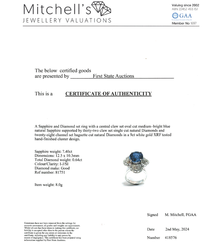 Sapphire and Diamond ring with oval shape Natural blue Sapphire of approximately 7.40ct and round Natural Diamonds totalling approximately 0.64cts (Estimated grading: I-J SI). 9ct white gold (XRF tested, not stamped). Ring size L½. Band width: 3.1 - 4.7mm. Weight: 8.0g. With Certificate #418576. (Pre-owned)