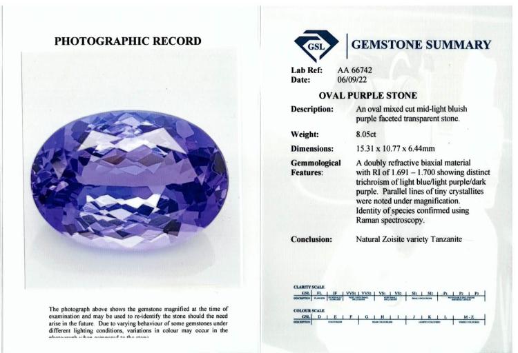 A loose oval shape Tanzanite of 8.05ct. Dimensions: 15.31mm x 10.77mm x 6.44mm. With GSL #AA66742. (As New)