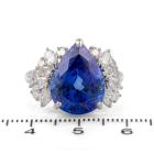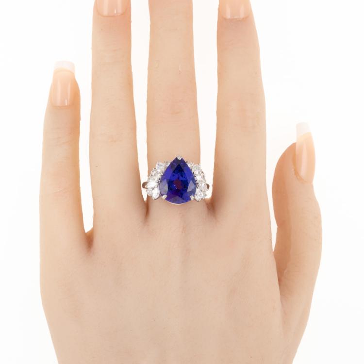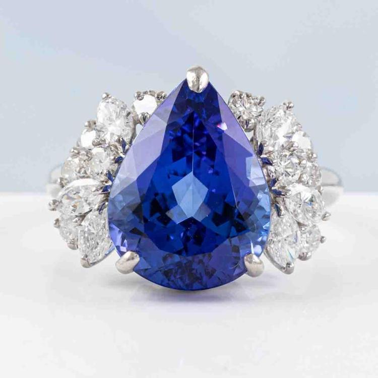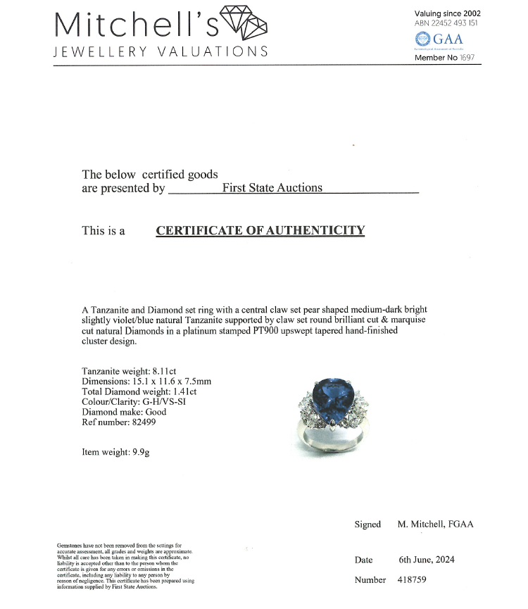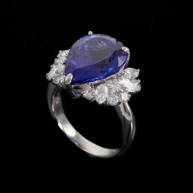 Tanzanite and Diamond ring with pear shape natural Tanzanite of 8.11ct and round & marquise cut natural Diamonds totalling 1.41ct (Estimated grading: G-H VS-SI). Platinum 900. Ring size N1/2. Band width: 2.8mm - 221mm. Weight: 9.9g. With Certificate #418759. (Pre-owned)