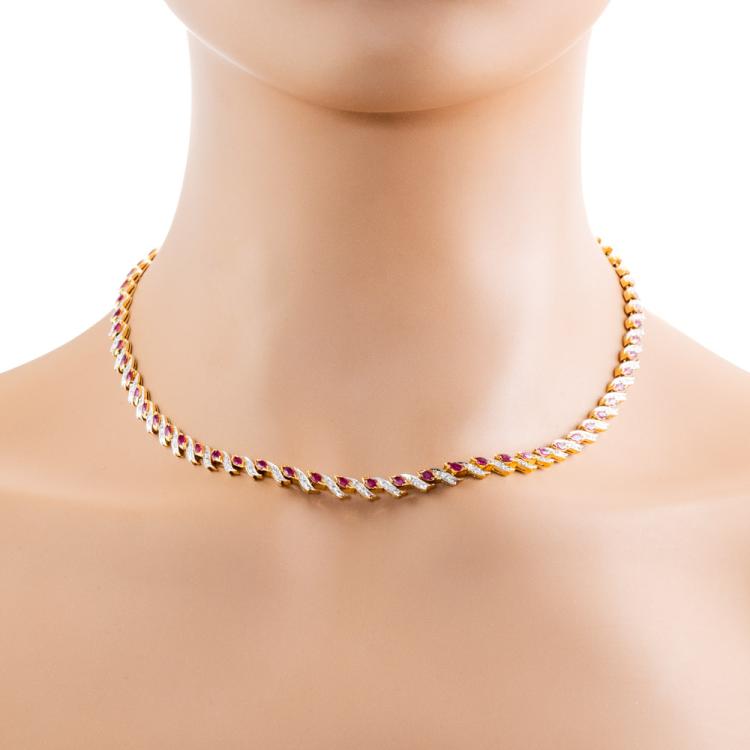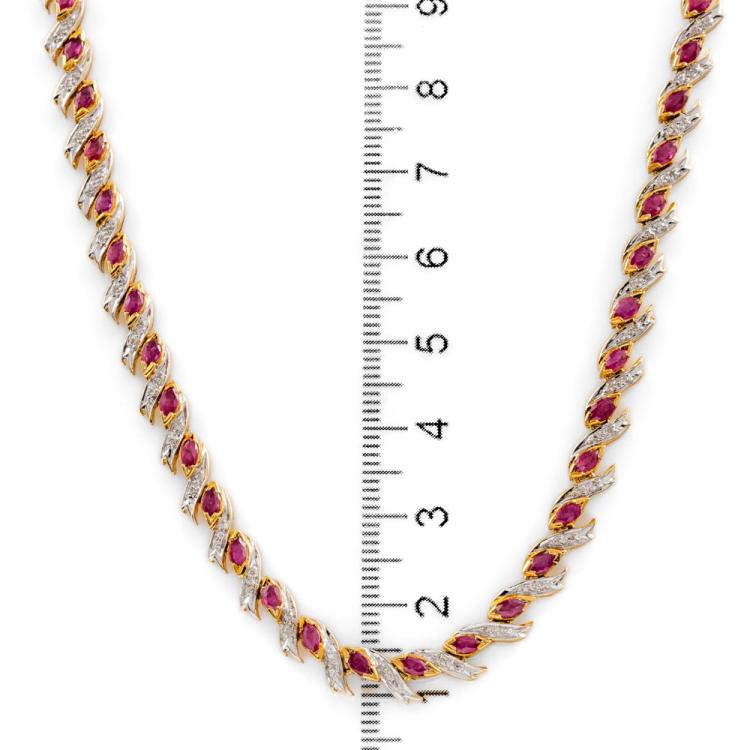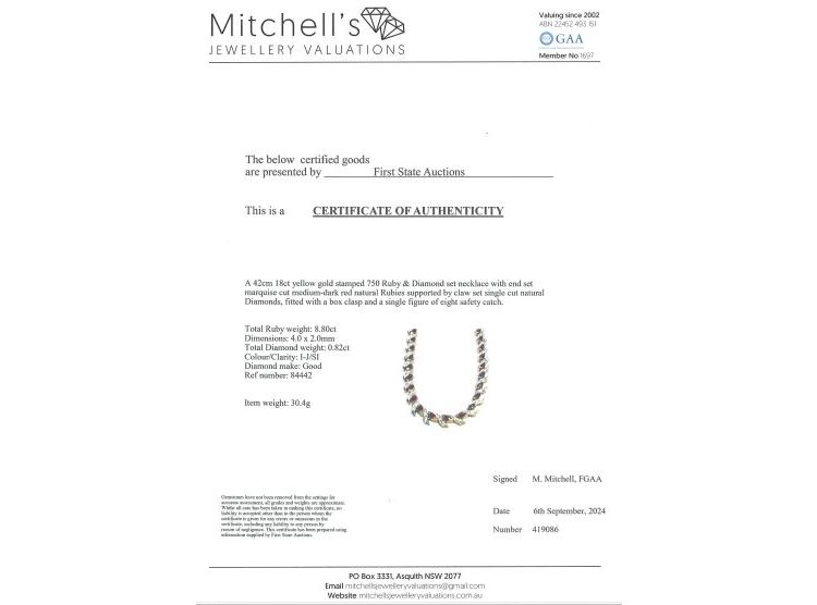 Ruby and Diamond necklace with marquise cut Natural Rubies totalling 8.80ct and round Natural Diamonds totalling 0.82ct (Estimated Grading: I-J SI). 18ct yellow gold. Length: 42cm. Weight: 30.4g. With certificate #419086. (Pre-owned)