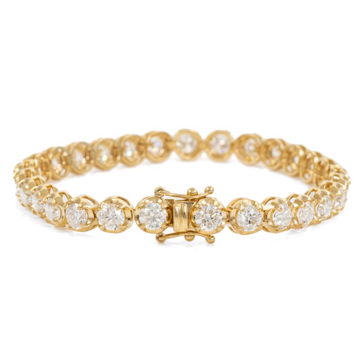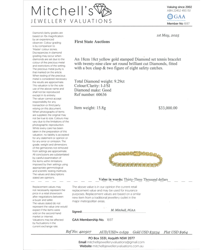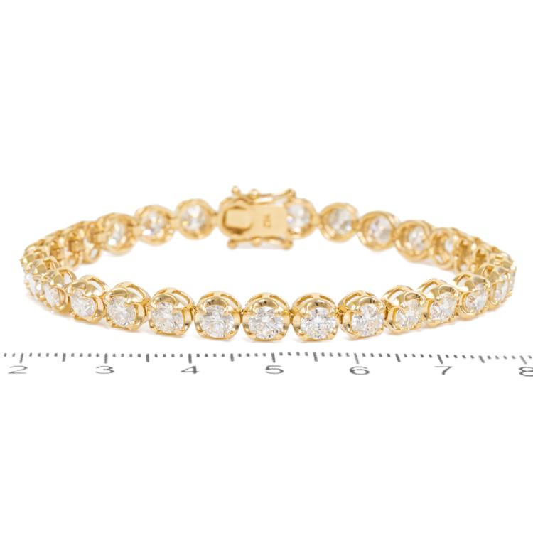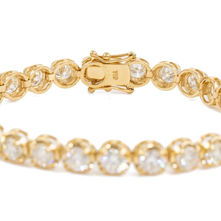 Diamond tennis bracelet with 29 round brilliant cut Natural Diamonds totalling 9.29ct (Estimated grading: I-J SI). 18ct yellow gold. Length: 18cm. Weight: 15.8g. With Valuation Certificate #420507. (New)