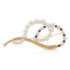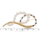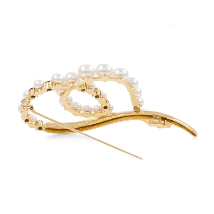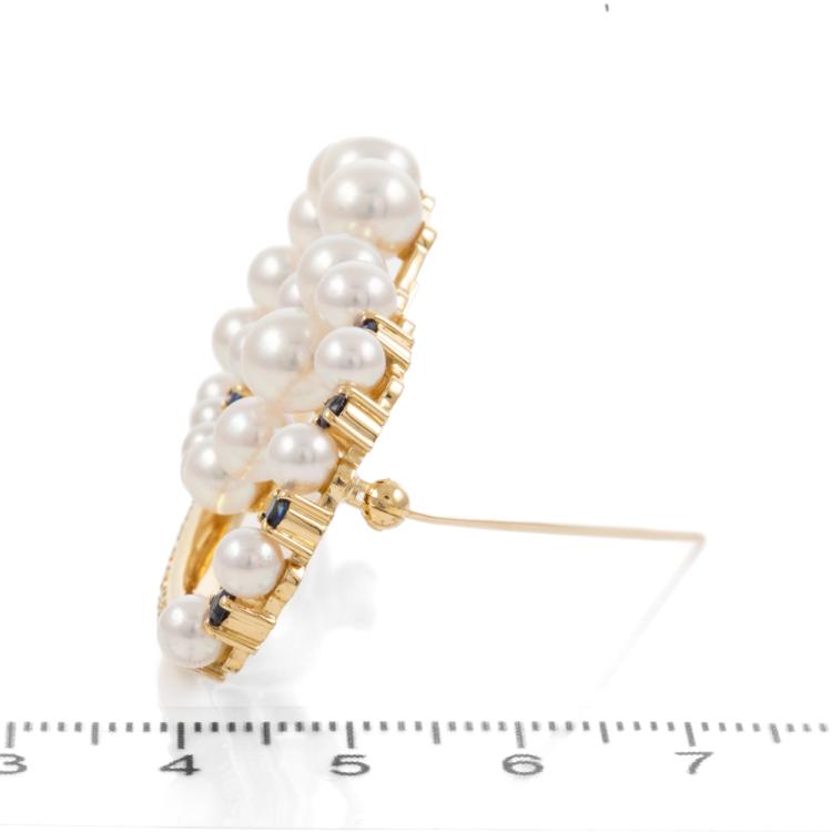 Pearl, Sapphire & Diamond brooch with Akoya Pearl of 6.3mm - 3.5mm, round blue Natural Sapphire totalling approximately 0.15ct and round Natural Diamonds totalling 0.07ct. 18ct yellow gold. Dimensions: 66cm x 34mm. Weight: 14.6g. (Pre-owned)
