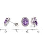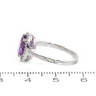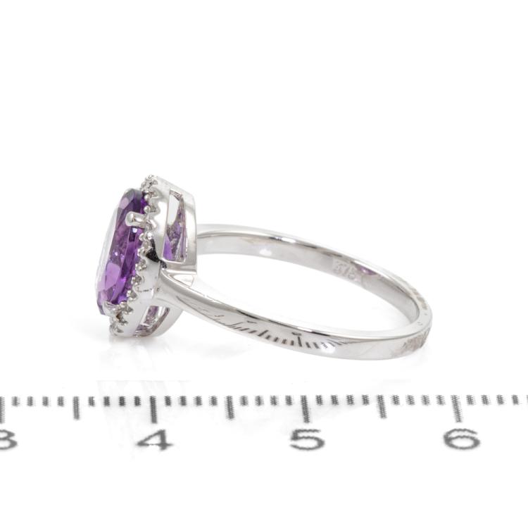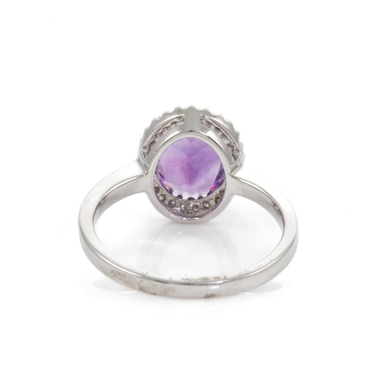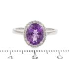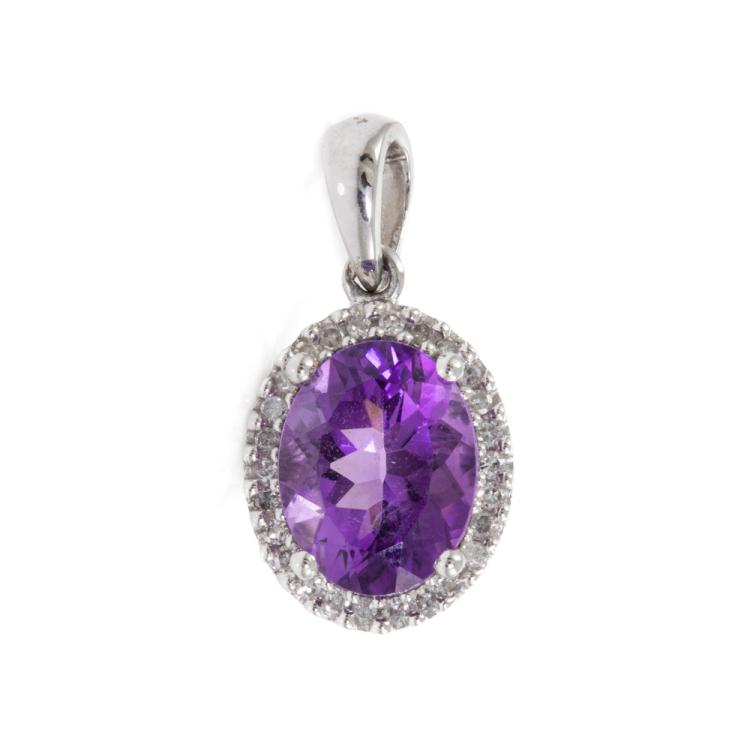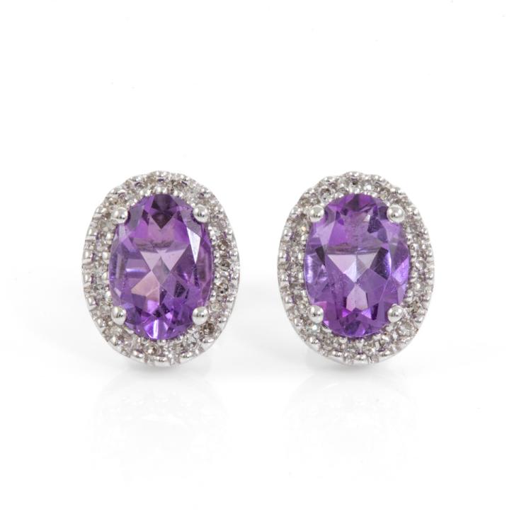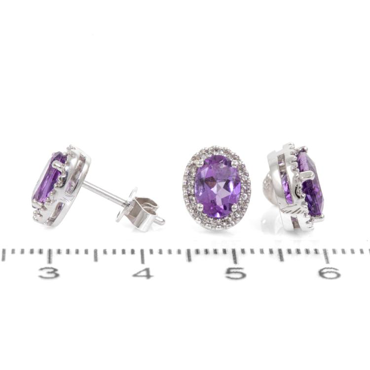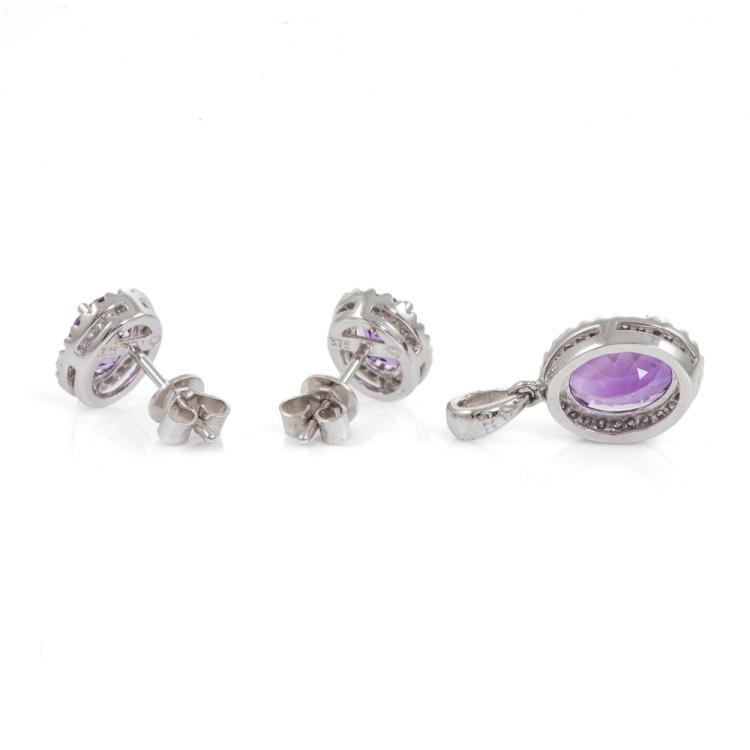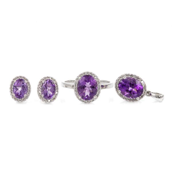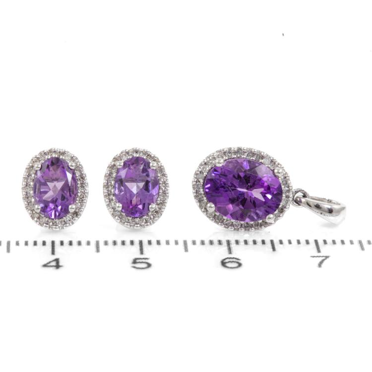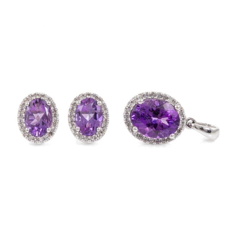 Three piece Amethyst set: 1) Amethyst ring with oval Natural Amethyst of approx. 1.50cts & round Natural Diamonds totalling 0.10cts. Ring size L. Band width: 1.8mm. 2) Amethyst earrings with oval Natural Amethyst totalling approx. 1.50cts & round Natural Diamonds of 0.15cts. 3) Amethyst pendant with oval Natural Amethyst of approx. 1.50cts & round Natural Diamonds totalling 0.10cts. No chain provided. All 9ct white gold. Combined weight: 6.4g (As new)