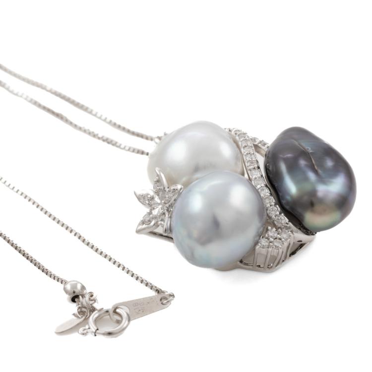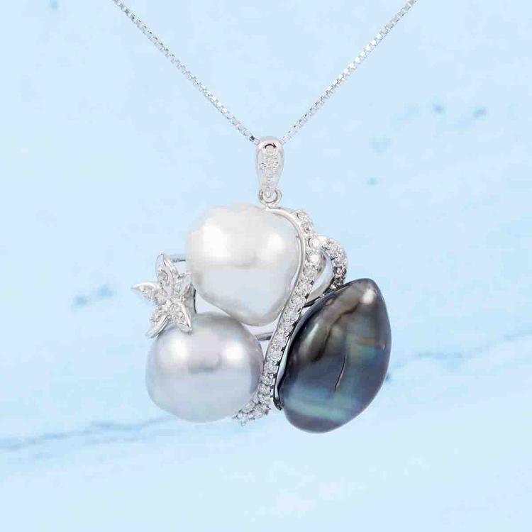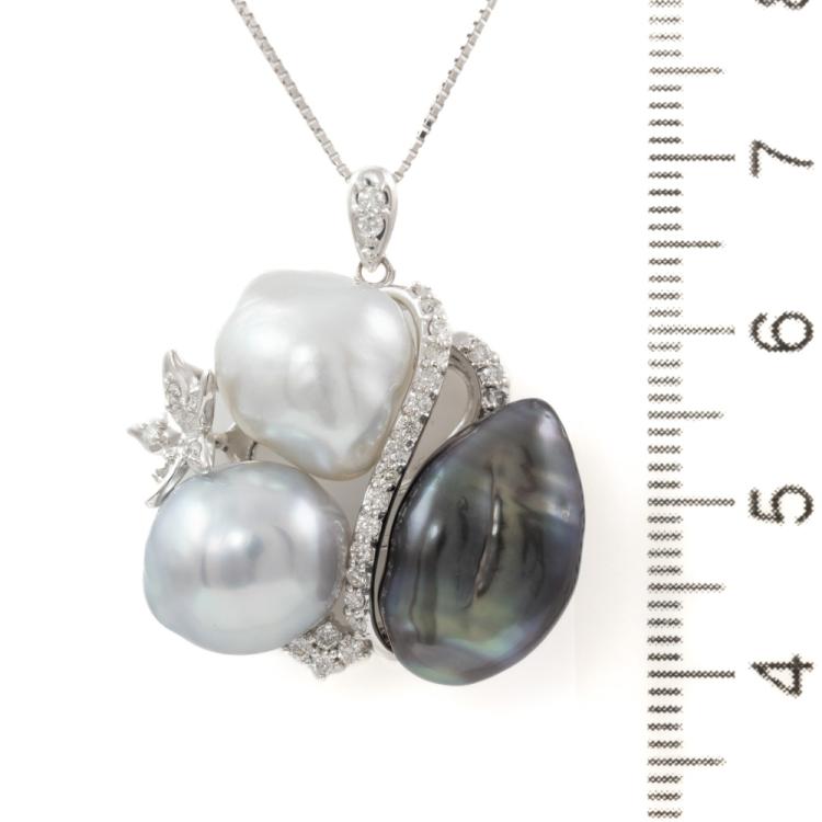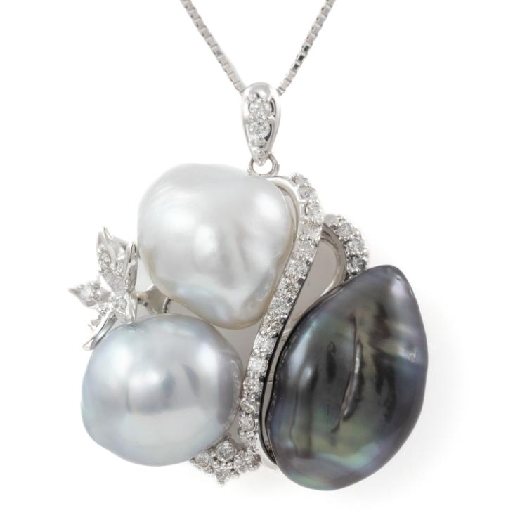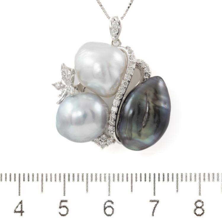 Pearl and Diamond pendant with 3 baroque Pearls (2 South Sea Pearls & 1 Tahitian Pearl) and round natural Diamonds totalling 0.35ct (Estimated grading: H-I SI). 18ct white gold with 18ct white gold adjustable 45cm chain. Weight: 11.2g. (Pre-owned)