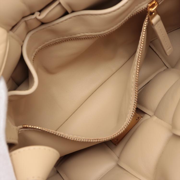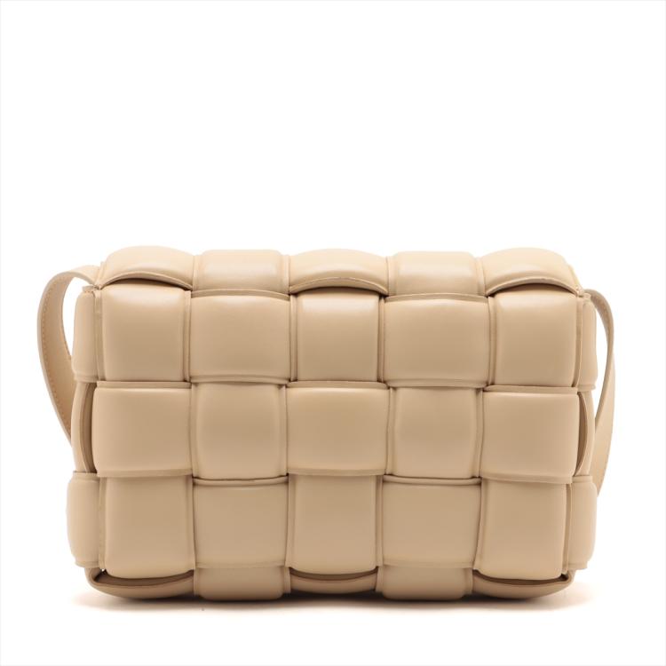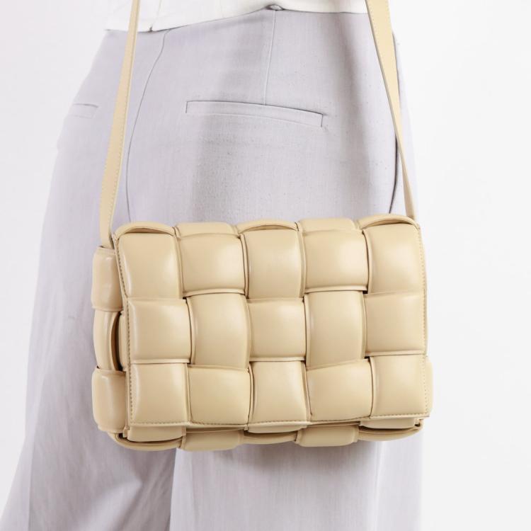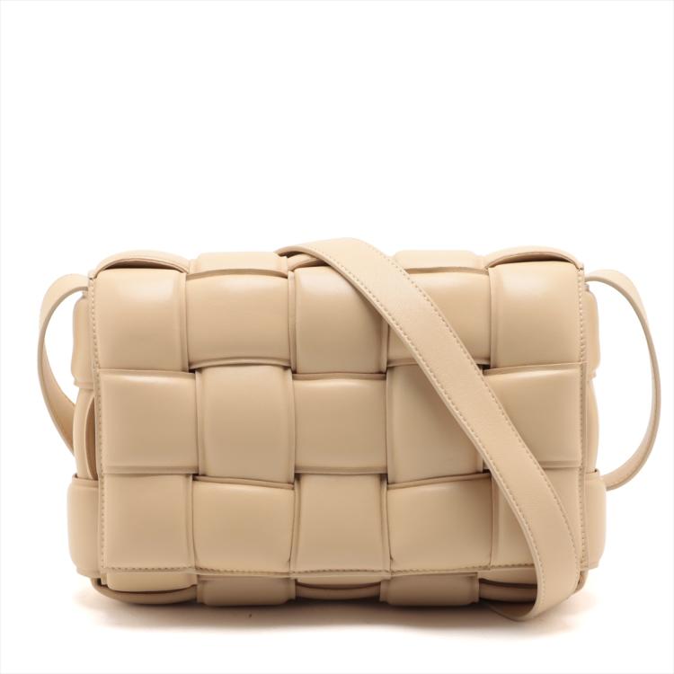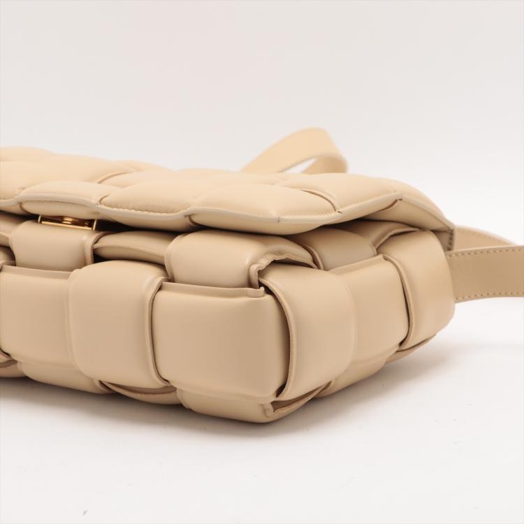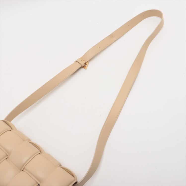 Bottega Veneta padded Cassette crossbody bag in beige Nappa Leather. Featuring Maxi Intrecciato design, gold-tone hardware, fold over flap with a push-up closure. It opens to a leather interior with a hanging zipper pocket. Approximate dimensions: 25cm (L) x 18cm (H) x 6.5cm (D), and 50-56cm adjustable shoulder strap drop. With Entrupy Certificate of Authenticity. (Pre-owned)