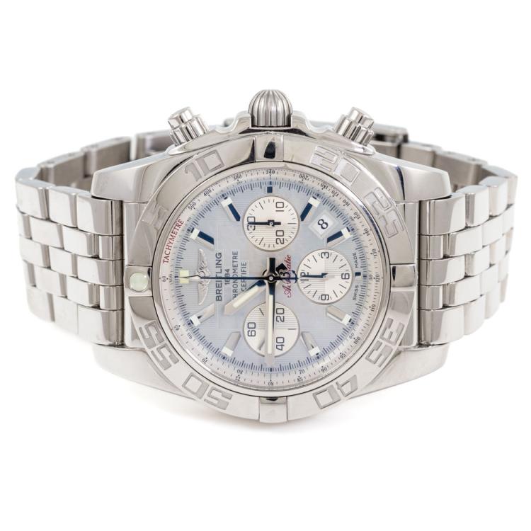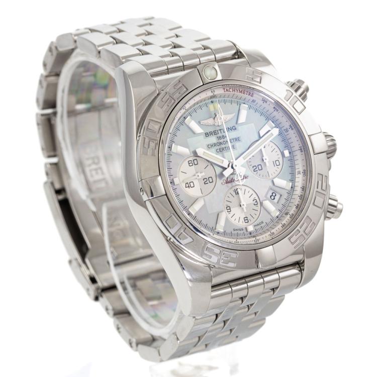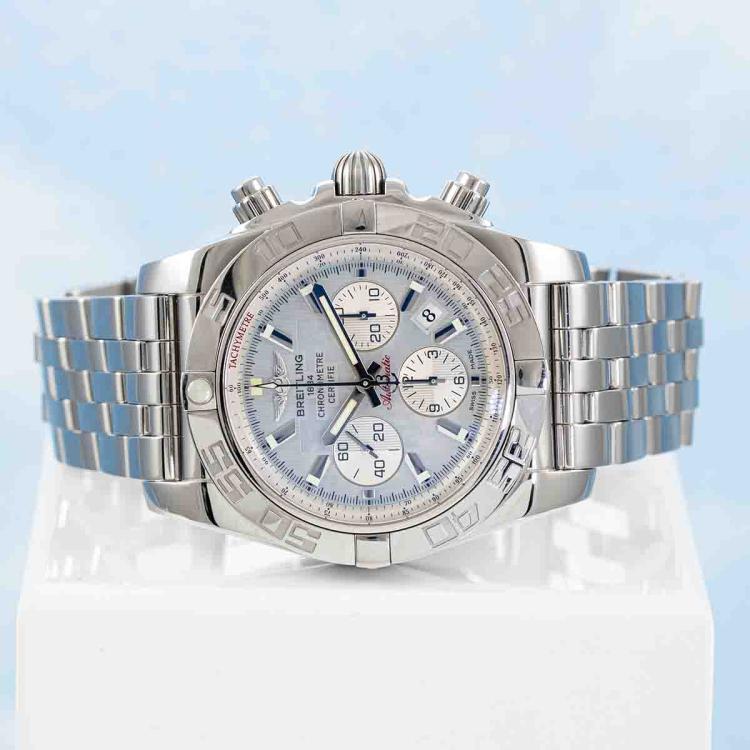 Breitling Chronomat stainless steel automatic mens watch. Mother of Pearl chronograph dial, date, case diameter: 44mm, wrist size: 20cm, Swiss made. Ref# A011G85PA. With Breitling stainless steel bracelet and clasp. With Certificate of Authenticity, Breitling International Warranty booklet dated 23/08/2011 and Breitling box. 3 month FSA warranty. (Pre-owned)