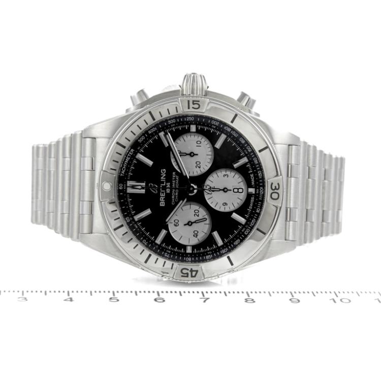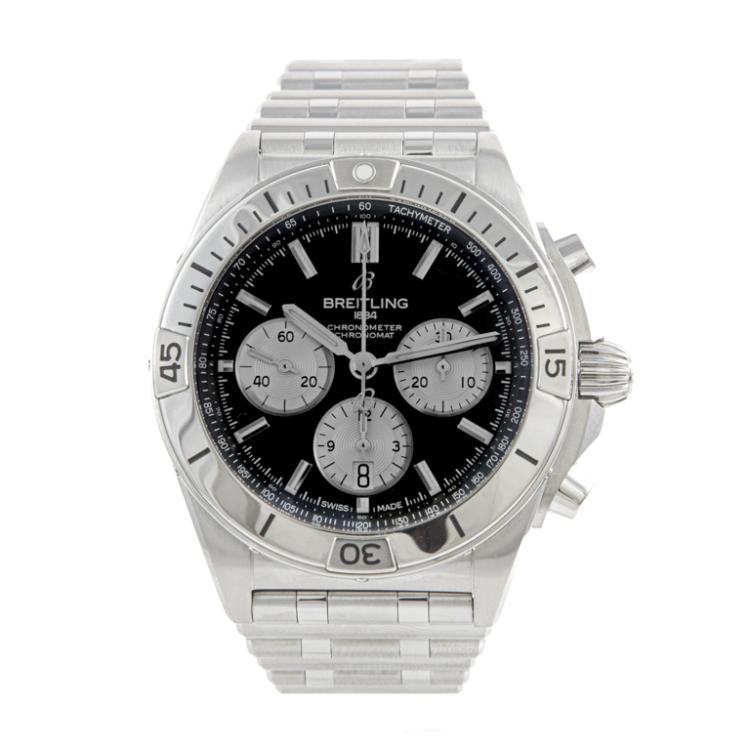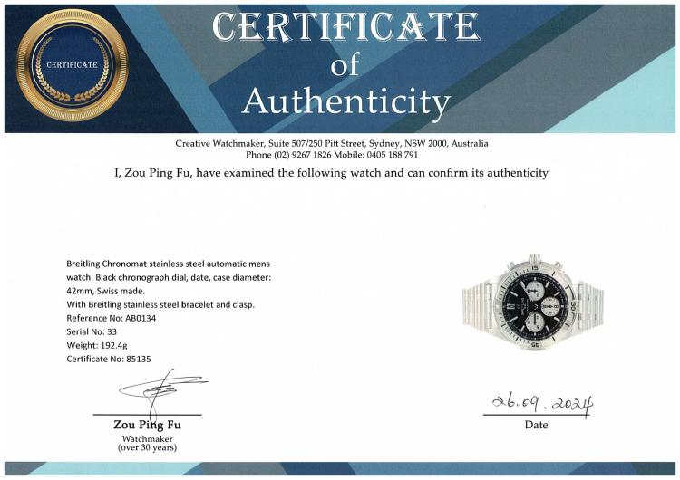 Breitling Chronomat stainless steel automatic mens watch. Black chronograph dial, date, case diameter: 42mm, wrist size: 19.5cm, Swiss made. Ref# AB0134. With Breitling stainless steel bracelet and clasp. With Certificate of Authenticity, Undated Breitling International warranty card and Breitling box. 3 month FSA warranty (Pre-owned)