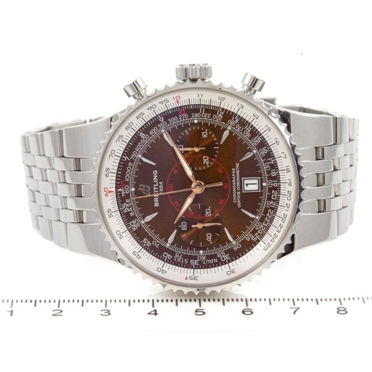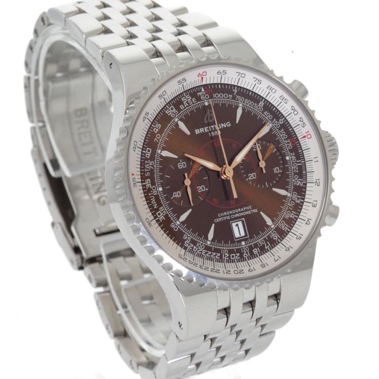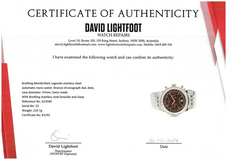 Breitling Montbrillant Legende stainless steel automatic mens watch. Bronze chronograph dial, date, case diameter: 47mm, wrist size: 21cm, Swiss made. Ref# A23340. With Breitling stainless steel bracelet and clasp. With Certificate of Authenticity. 3 month FSA warranty (Pre-owned)