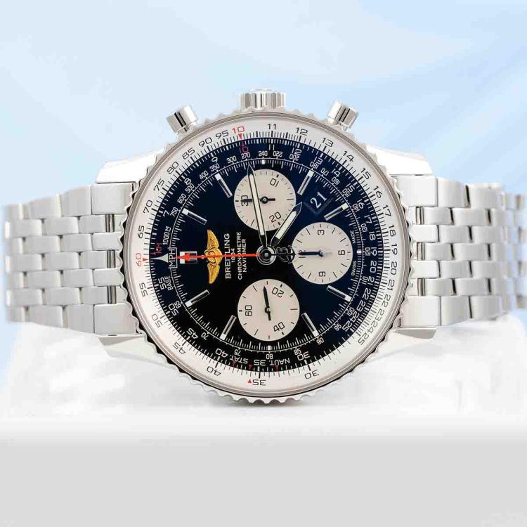 Breitling Navitimer 01 stainless steel automatic mens watch. Black chronograph dial, date, case diameter: 43mm, wrist size: 19.5cm, Swiss made. Ref# AB0120. With Breitling stainless steel and clasp. With Certificate of Authenticity and Breitling case. 3 month FSA warranty. (Pre-owned)