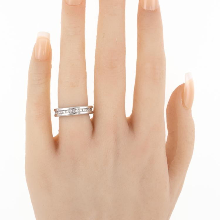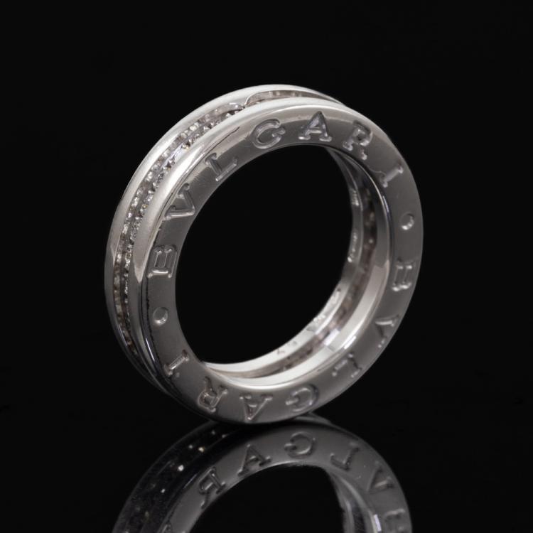 Bvlgari B.Zero1 one band ring with pave round natural Diamonds totalling 0.45ct (Estimated grading: F VS). 18ct white gold. Bvlgari stamped size 49, actual size I 1/2 - ring resizing is not recommend. Band width: 4.7mm. Made in Italy. Weight: 6.6g. With Bvlgari box. (Pre-owned)
