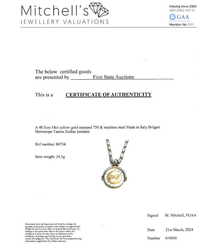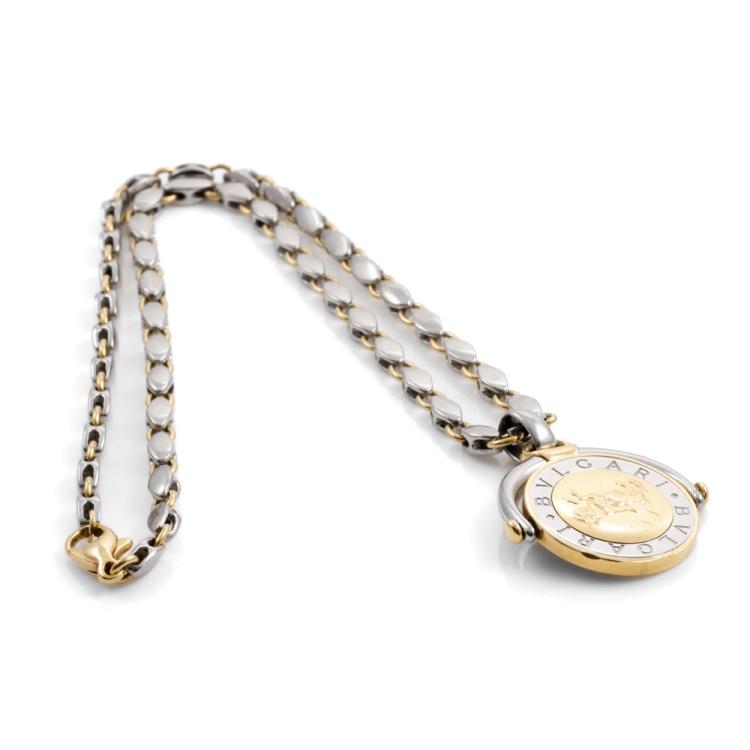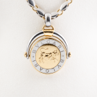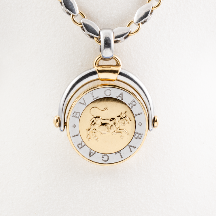 Bvlgari Taurus Zodiac sign flip medallion necklace. 18ct yellow gold & stainless steel with 18ct yellow gold and stainless steel chain. Length: 40.5cm. Weight: 34.3g. With Certificate #418456. (Pre-owned)