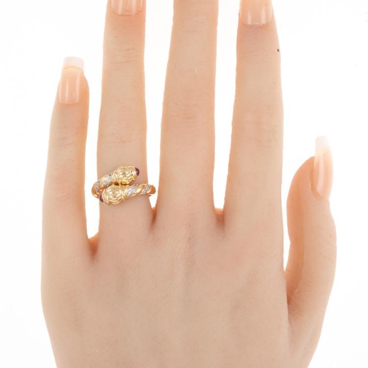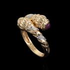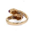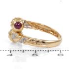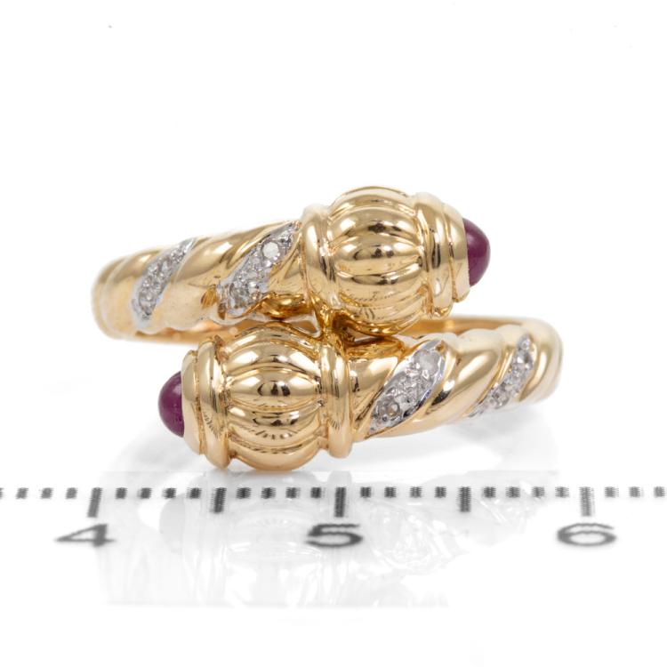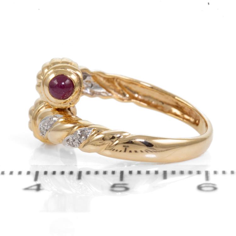 Ruby and Diamond ring with cabochon round natural Rubies totalling approx. 0.40cts and round natural Diamonds totalling approx. 0.20cts. 14ct yellow and white gold. Ring size: M. Band width: 2.50mm - 3.30mm. Weight: 3.9g. (Pre-owned)